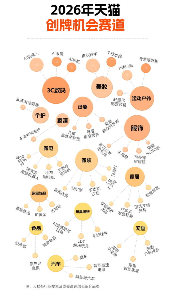 从潜力赛道来看,报告发布了 2026 年 50 个蓝海机会,包括智能机器人、AI 眼镜、皮肤科学、个性妆容、可外穿家居服、植鞣 HOBO 包、家装轻定制、智能床垫、钛餐厨具、小球运动、轻量化运动装备、专业越野跑、宠物户外等,当前用户相关搜索及购买热度持续上升,品牌增长空间较大。
