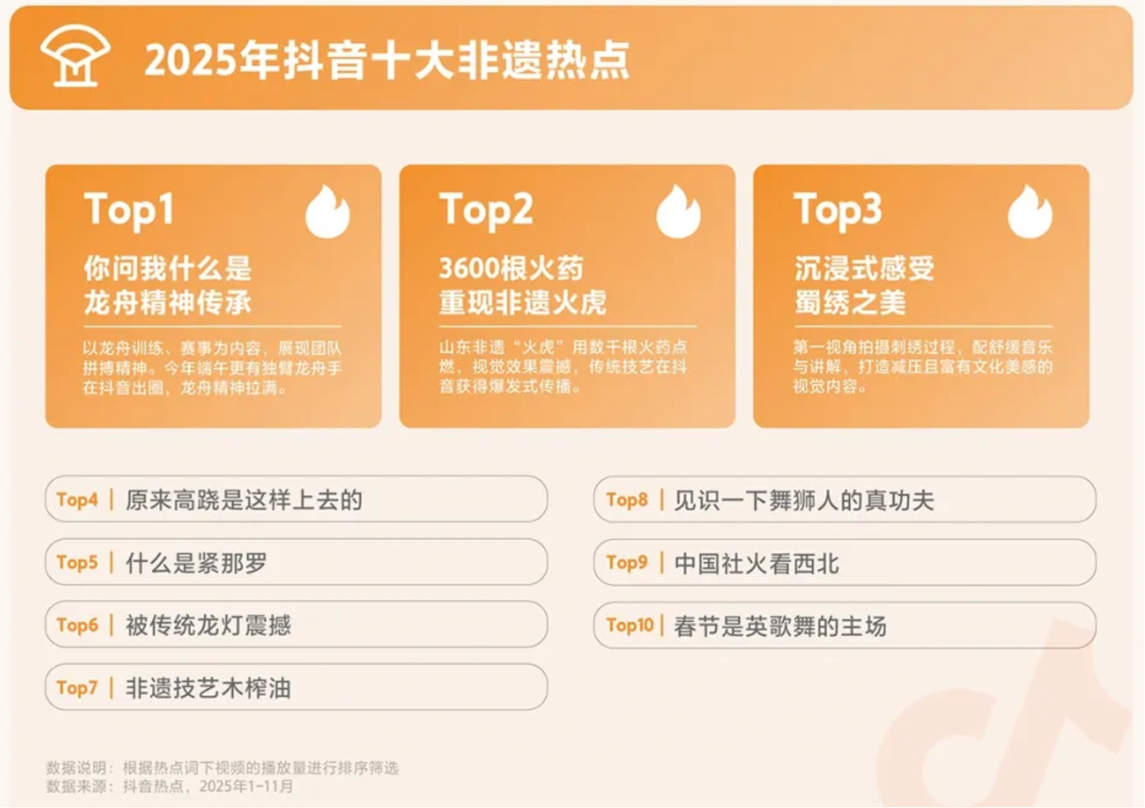 传统文化依然是抖音用户的关注热点,创作者采用更多新鲜方式触碰传统:到山林乡间学习近乎「失传」的舞姿;在一针一线中品鉴蜀绣之美;于博物馆和「显眼包」文物跨时空对话......同时,传统文化也以更贴近生活的姿态融入日常,AI 技术、博物馆文创等等,以更丰富的表现形式,助力传统文化愈加可感可知,实现文化破圈。