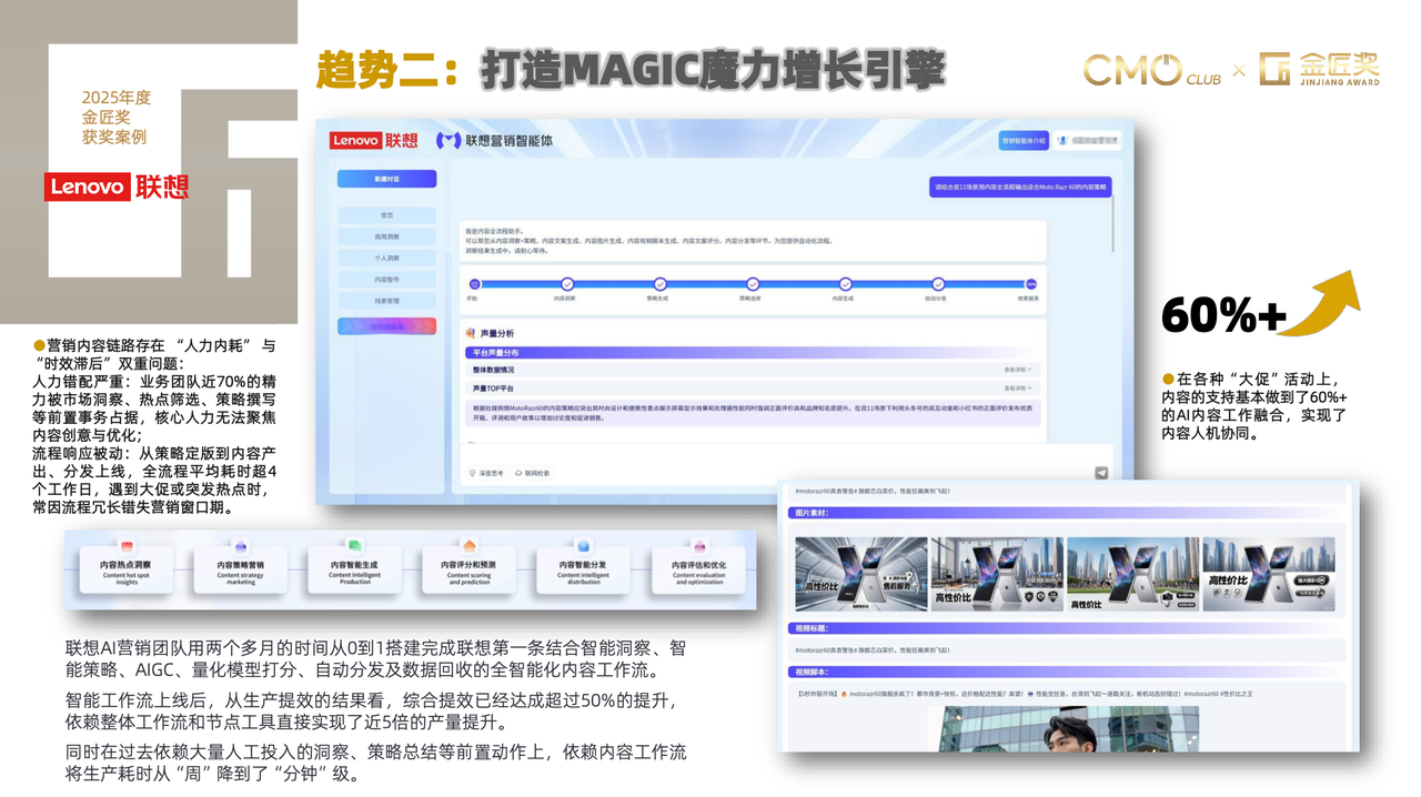 此外,MAGIC 智能营销框架为企业提供了一套系统化、可落地的 AI Agent 应用指南,成为企业构建智能营销体系的最佳范式参考:M(Mine 发掘需求)、A(Architect 编排旅程)、G(Generate 生成内容)、I(Interact 互动触达)、C(Check 核查复盘)。这一框架在联想内容工作流的搭建案例中得到了充分应用,并且实现了综合提效超 50%、内容产量提升近 5 倍等亮眼效果,验证了其实战价值。
