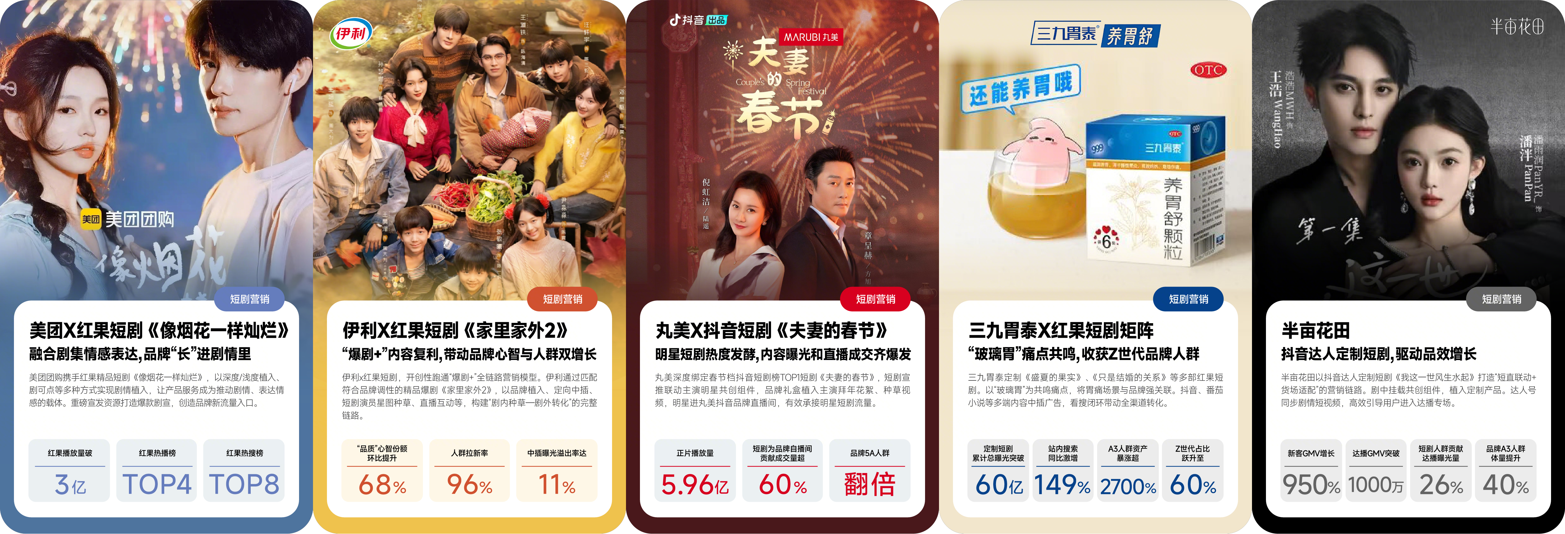 结合抖音与红果短剧的生态资源,巨量引擎为品牌提供从内容定制、品牌广告投放、深度植入、短剧达人共创到效果追踪的全链路短剧营销能力。让品牌不仅能与平台创作者生态联动完成内容共创,更能将产品与服务融入短剧真实场景,实现更原生的内容表达与更沉浸的用户沟通。美团、伊利、丸美、三九胃泰、半亩花田等品牌借助巨量引擎提供的「剧内种草—剧外搜索——直播转化」的完整链路,让品牌信息在用户心中形成长期记忆,将内容势能转化为长期的生意潜能。