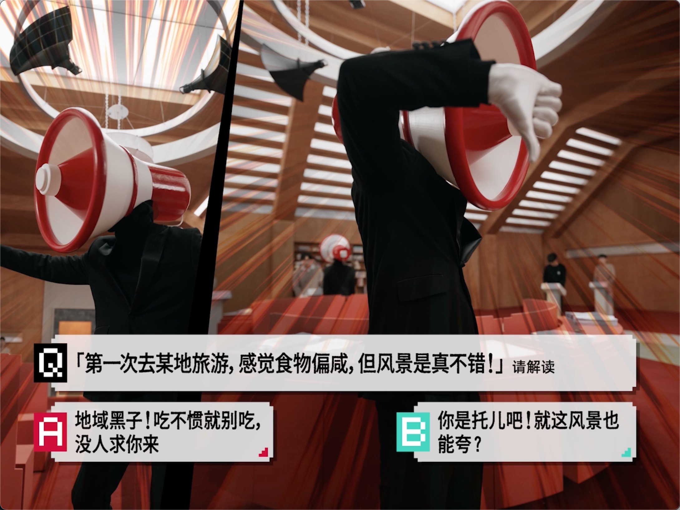 在非黑即白的世界里,人们一不小心就容易变成「夹心饼干」。以此为灵感,短片构建出了一个能帮助大家提高社交能力的「网络生存测试」空间。