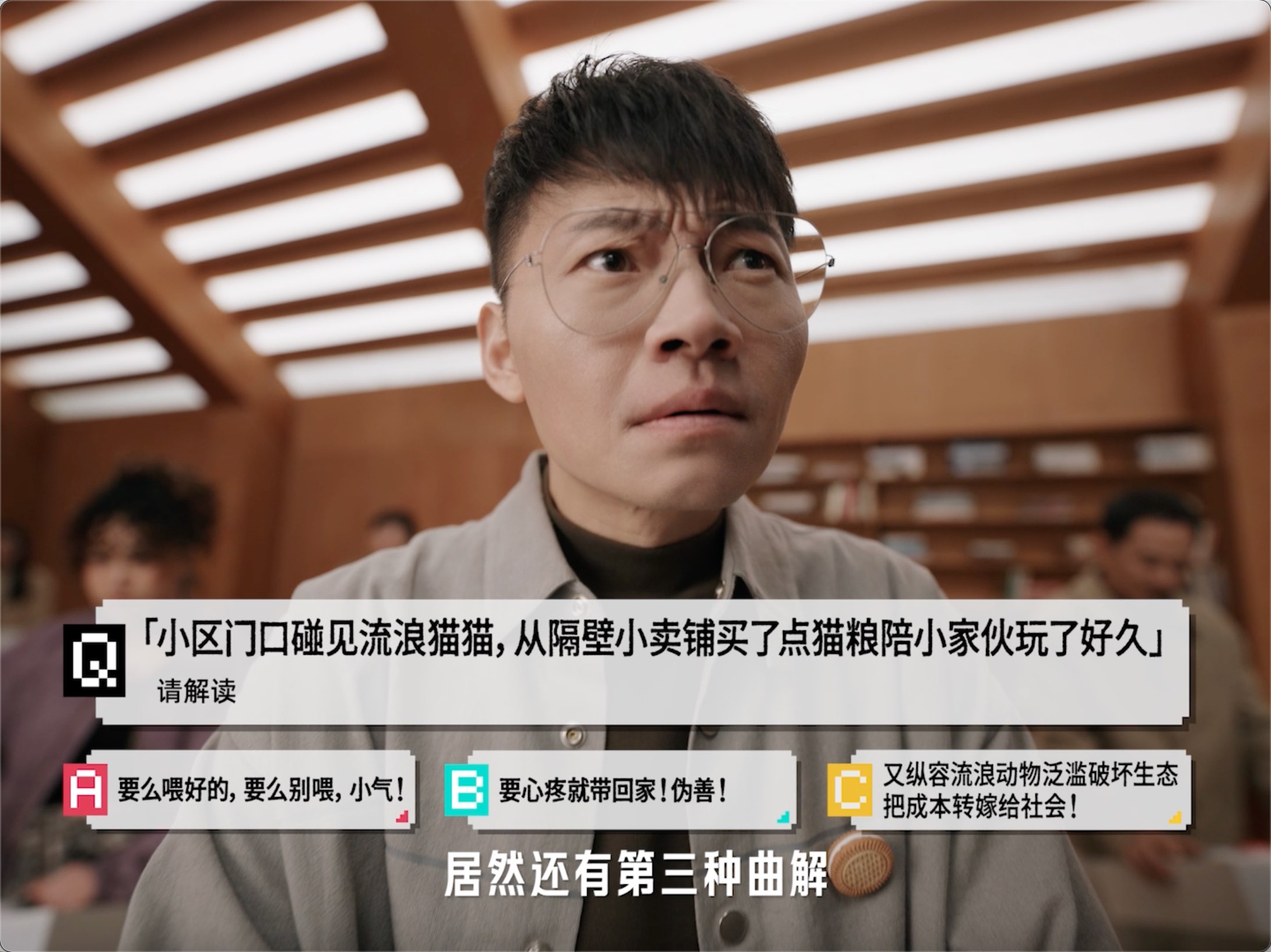 为了让深受引战与对立困扰的普通人产生更强的代入感,小红书的公益短片并没有采用传统口号式的呼吁和引导,而是将现实中的对立场景转化为一场沉浸式的「网络问答模拟游戏」: