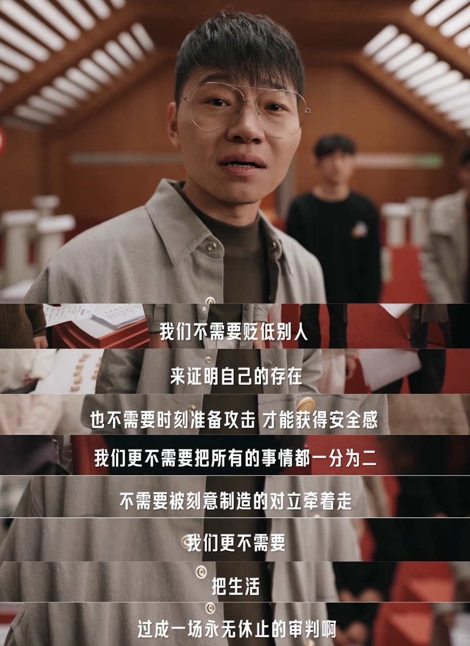 更重要的是,这支公益短片没有沿用平台主导发声的叙事逻辑,而是主动退后,呈现现实情况,将焦点留给议题本身和真实的人。在众人觉醒的关键时刻,镜头对准的是一张张真实的面孔;结尾处主人公的发言不沉重、不说教,但却掷地有声地表明了拒绝荒诞测试核心立场,一连串「这套对立的眼光到底是在帮助谁?」「又到底在看不起谁?」的发问,也在观众心中埋下反思的种子。