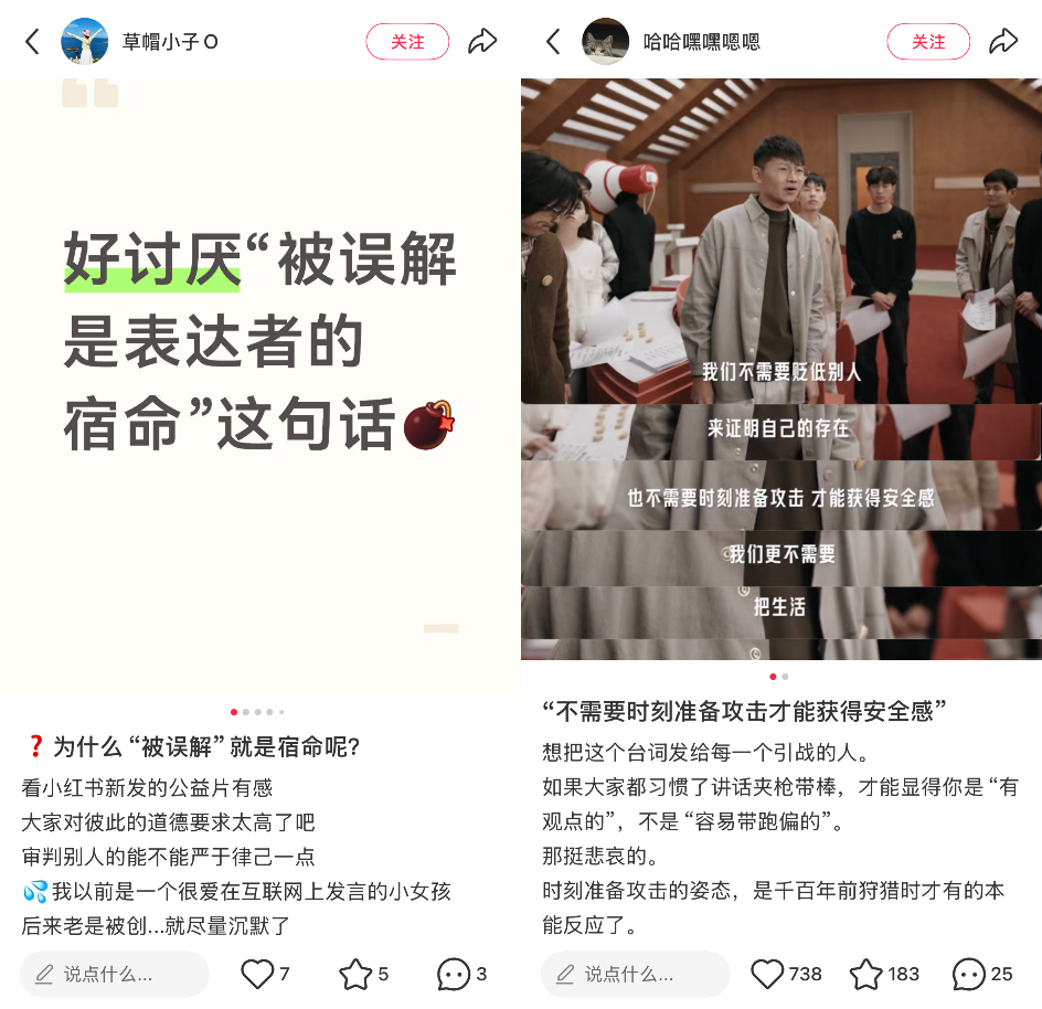 其实第一次看到小红书这支短片的时候,就因为它能表达这么「鲜明」的态度感到了一丝意外,后来一想,这何尝不是形成了一种完美互文。如今的网络环境,让任何发言都变得小心翼翼,表达的边界被不断压缩。小红书这次没有隔靴搔痒,切中了大家最大的痛点,立意本身就让人眼前一亮。
