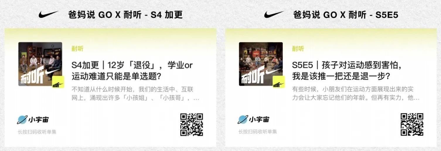 自 2022 年,他们曾连续两年多为 Nike 打造了「爸妈说 GO」内容 IP,聚焦运动和亲子关系,创作了《上板吧,菜菜》《好样的,豆豆》《放开跳,乐乐》《卡卡,有办法》《组队吧,女孩们》《溪洋难不倒》等多支纪录片,以及两集《耐听》播客,以连贯的创意支持,参与了 Nike 与中国消费者之间持续的对话体系构建。