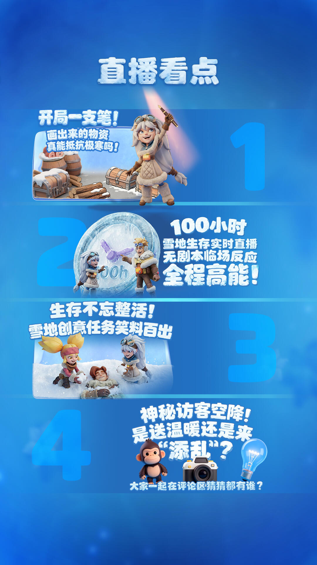 继去年 8 月,斩获累计超 2 亿观看人次的「 Tim 100 小时荒岛求生不间断直播」后,影视飓风又整新活了,这回是和《无尽冬日》游戏合作,开启「100 小时雪地生存直播挑战」。直播开局,Tim 仅有几张白纸,需要以绘画创作的方式兑换物资,同时完成导演组安排的各项任务。这种用创作换取生存资源的设定,高度还原了《无尽冬日》冰雪末日生存的游戏主题,也拉满了直播所需的话题与趣味性,使得 Tim 电子宠物的形象更加深入人心。