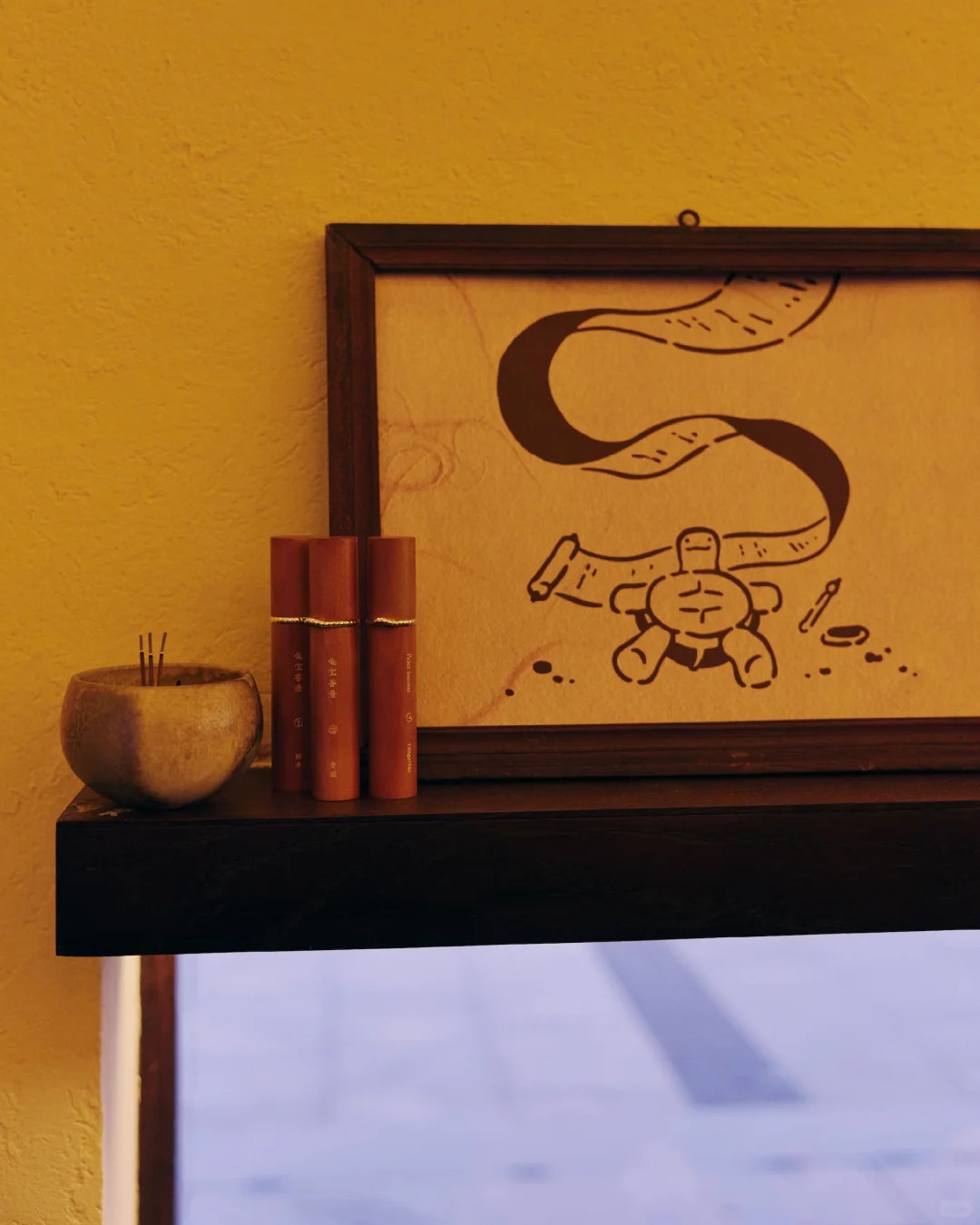快闪店的设计则将品牌理念进一步具象化,不仅将龟背的「格」作为外观的核心线索,更将乌龟这一视觉符号融入空间各处。更巧妙的是,品牌还将福建传统制香工艺中的重要储具——陶缸搬到了线下门店,邀请消费者通过转动木质盖子来闻香。这种需要「慢下来、用心感受」的互动设计,既是对传统制香文化的致敬,也是对品牌理念的再次强调。承袭母品牌一贯见长的品牌叙事能力,「龟宝香居」也为线香这一传统品类,注入了当代审美与内容思考。