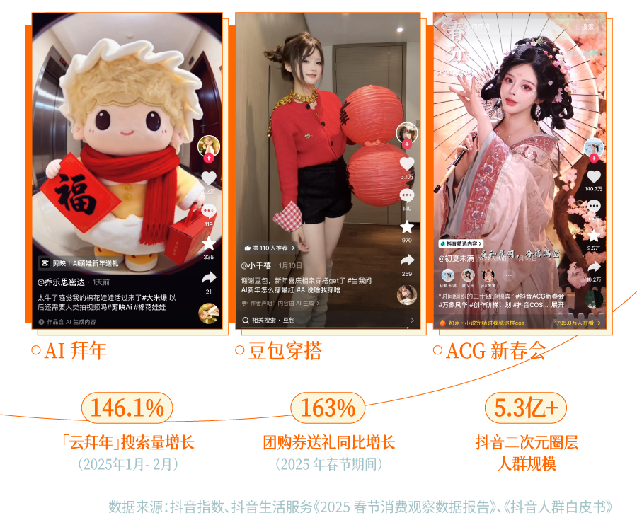 另一方面,对于想要走近不同圈层的品牌,理解圈层独有的社交语境成了关键。在同好相聚的新年场景中,品牌需要让他们感受到「懂我」。今年二次元就有了自己的年会,「抖音 ACG 新春会」IP 集结了顶尖游戏、动漫 IP 以及百余位 ACG 头部达人,持续带来定制音乐、同人二创等二次元爱看的新春内容,让品牌能以共通的语言触达圈层核心受众。
