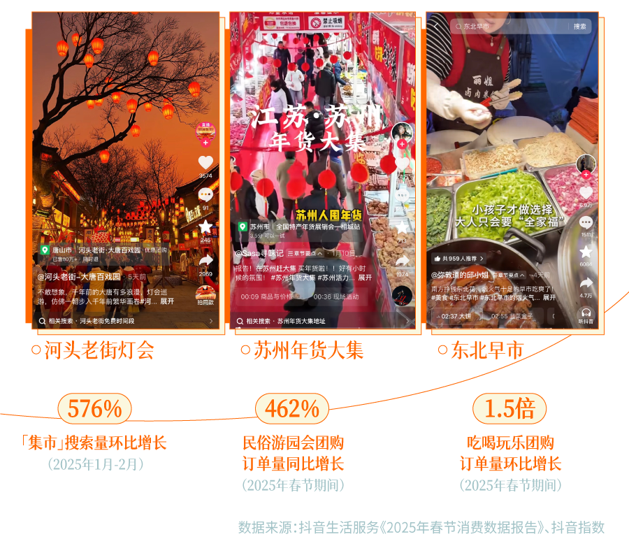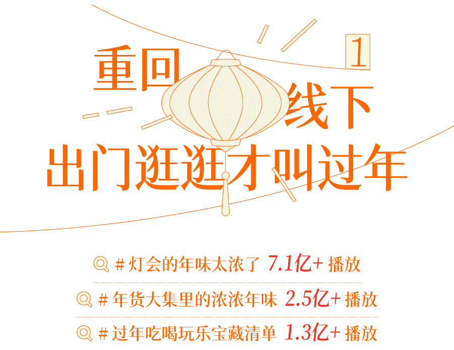 作为数字时代的原住民,越来越多年轻人希望回到具体的场景里去,找回虚拟世界无法取代的人情味。因此,想要感受年味的年轻人,更渴求线下才能带来的生命力与在场感。在这样的情绪共识下,#灯会的年味太浓了、#年货大集里的浓浓年味等话题突破数亿次播放,去年春节期间抖音的民俗游园会团购订单量也同比增长 462%。