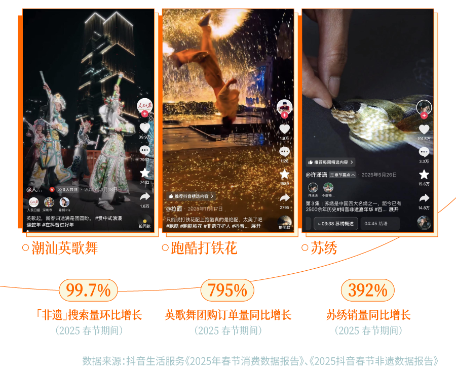 出圈的非遗民俗,也吸引着年轻人为了一种文化奔赴一座城。去年春节,「鱼灯」投稿量在抖音同比增长 168%,带动了黄山歙县吃喝游玩订单量猛增 458%。各大景区的文化大秀更是让人心动,英歌舞相关团购订单量同比增长 795%。