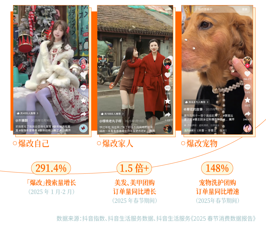 这股「焕新」热潮,也体现在了 CBNData 联合抖音生活服务发布的《2025 春节消费数据报告》中,2025 年春节期间美发和美甲团购订单量均达到 2024 年的 1.5 倍以上。