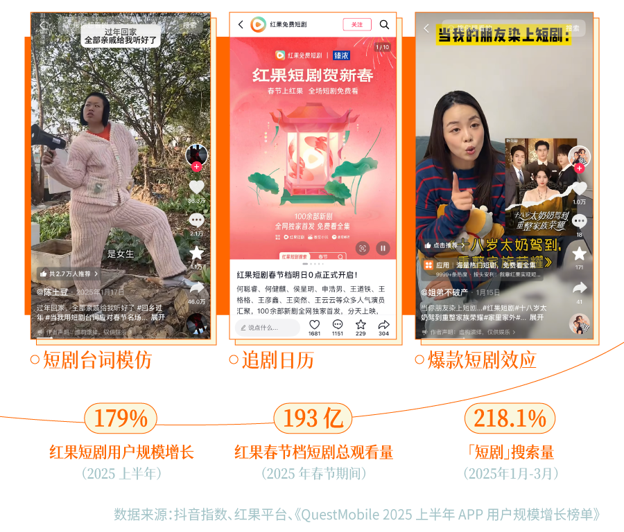 春节档短剧市场,同样展现出更多样化的活力,2025 年春节,仅行业头部平台红果短剧就发布百余部作品,还首次发布春节档追剧日历,让短剧爱好者再也不用担心剧荒。
