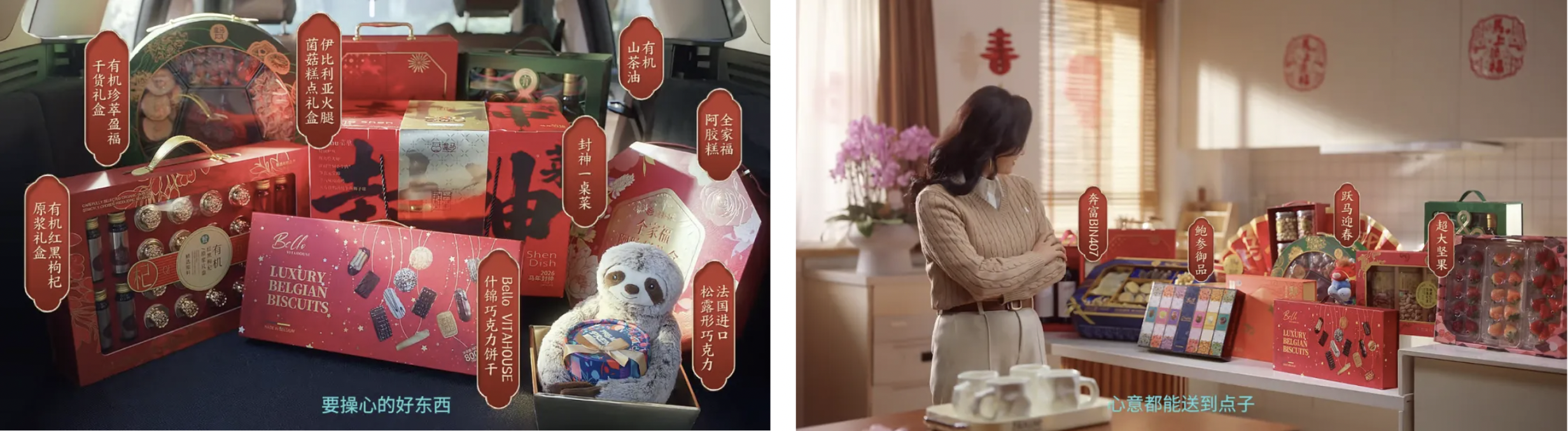 送给长辈的 100% 白桦树汁、低糖杂粮糕点;送礼用的歌帝梵马年限定巧克力、印尼原盏燕窝;为年夜饭准备的澳洲和牛、俄罗斯帝王蟹……