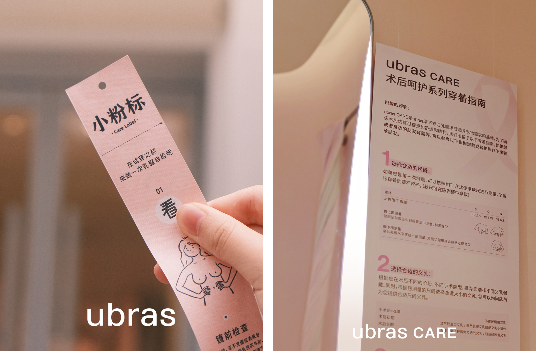 另一方面,ubras 也持续呼吁更多人关注这一议题,在行业内首创乳腺自检衣标「小粉标」;在三八妇女节、10 月粉红丝带月等相关节点,ubras 都曾发起乳腺癌防治宣传活动,借助公益短片、义乳捐赠、科普讲座、免费筛查等形式,用更加专业的方式与更加温暖的行动,呵护女性身心健康。
