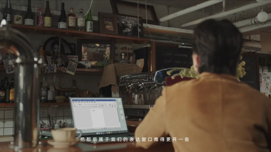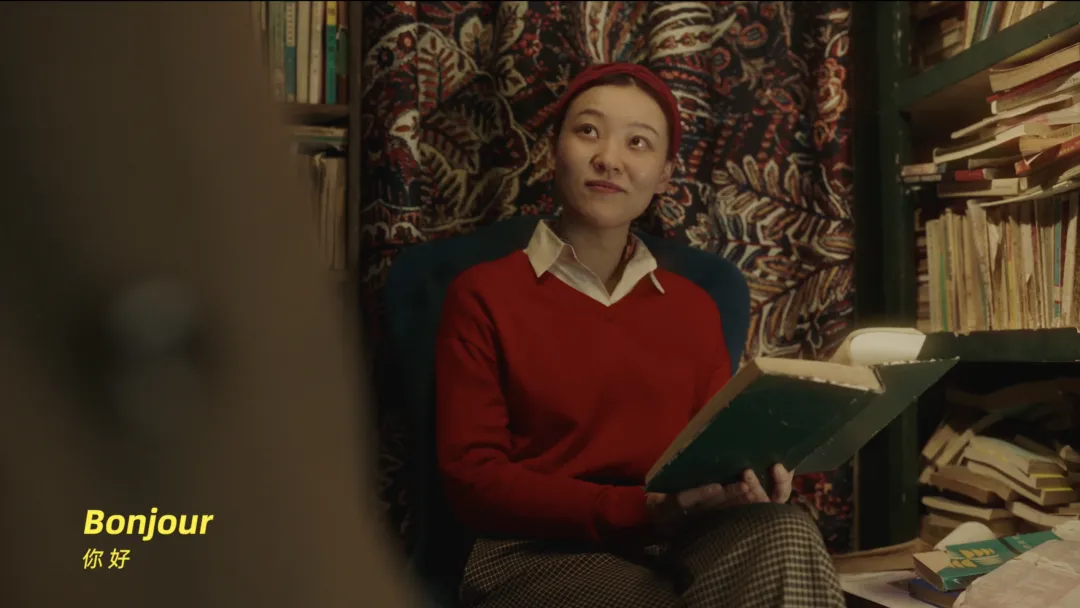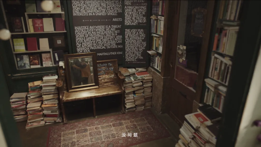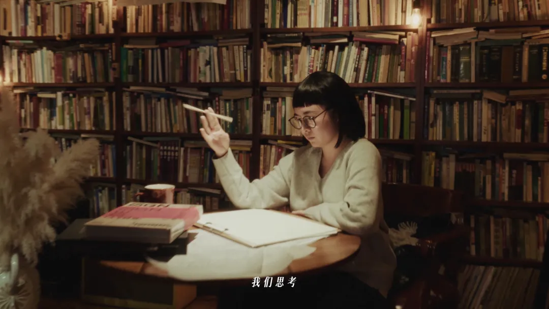 与现实相对应的,是书店咖啡馆这一颇有设计感的场景设定,形成了一处虚实交汇的独特空间。在周轶君的视角下,书架上随处可见的女性主义经典书籍,成为打开思想的钥匙。而其中极具代表性的先锋女性形象——波伏娃、伍尔夫、金斯伯格......化身「思想的影子」从书中走了出来,形成一幕幕富有奇幻色彩的内心剧场,也悄然构成了整支短片「看不见」的故事暗线。