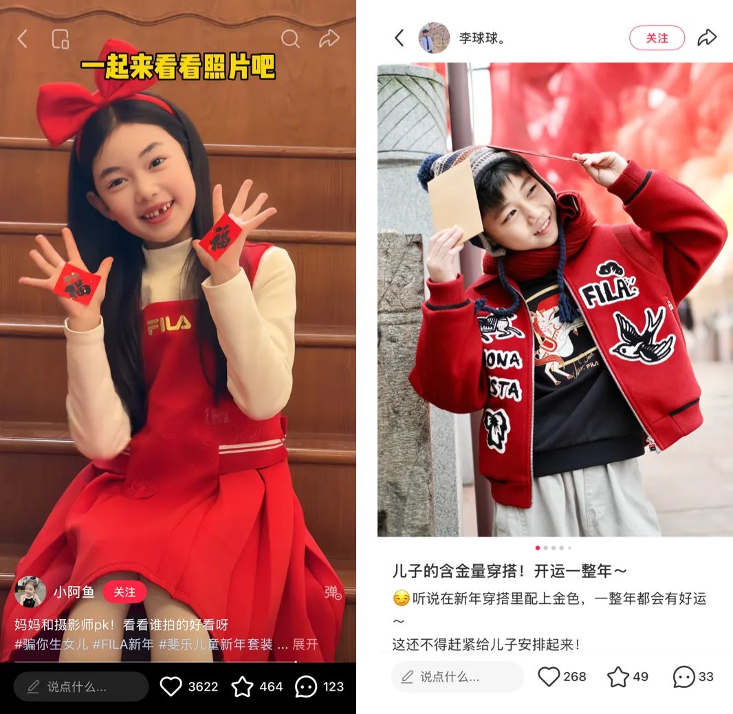 小酒窝的「千金转转裙」、西北 F3 的「抓马毛衣」「抓马卫衣」均来自 FILA KIDS 的「抓马新年」限定系列。以红色与金色为主色调,FILA KIDS 引入了旋转木马的概念,运用装饰着羽毛与花卉纹样的金马刺绣、中世纪盔甲马等等设计元素,既贴合新春氛围,又彰显品牌时尚调性,在社交平台上掀起了一股「金贵风」的穿搭趋势,吸引到不少「星二代」上身「抓马」同款。