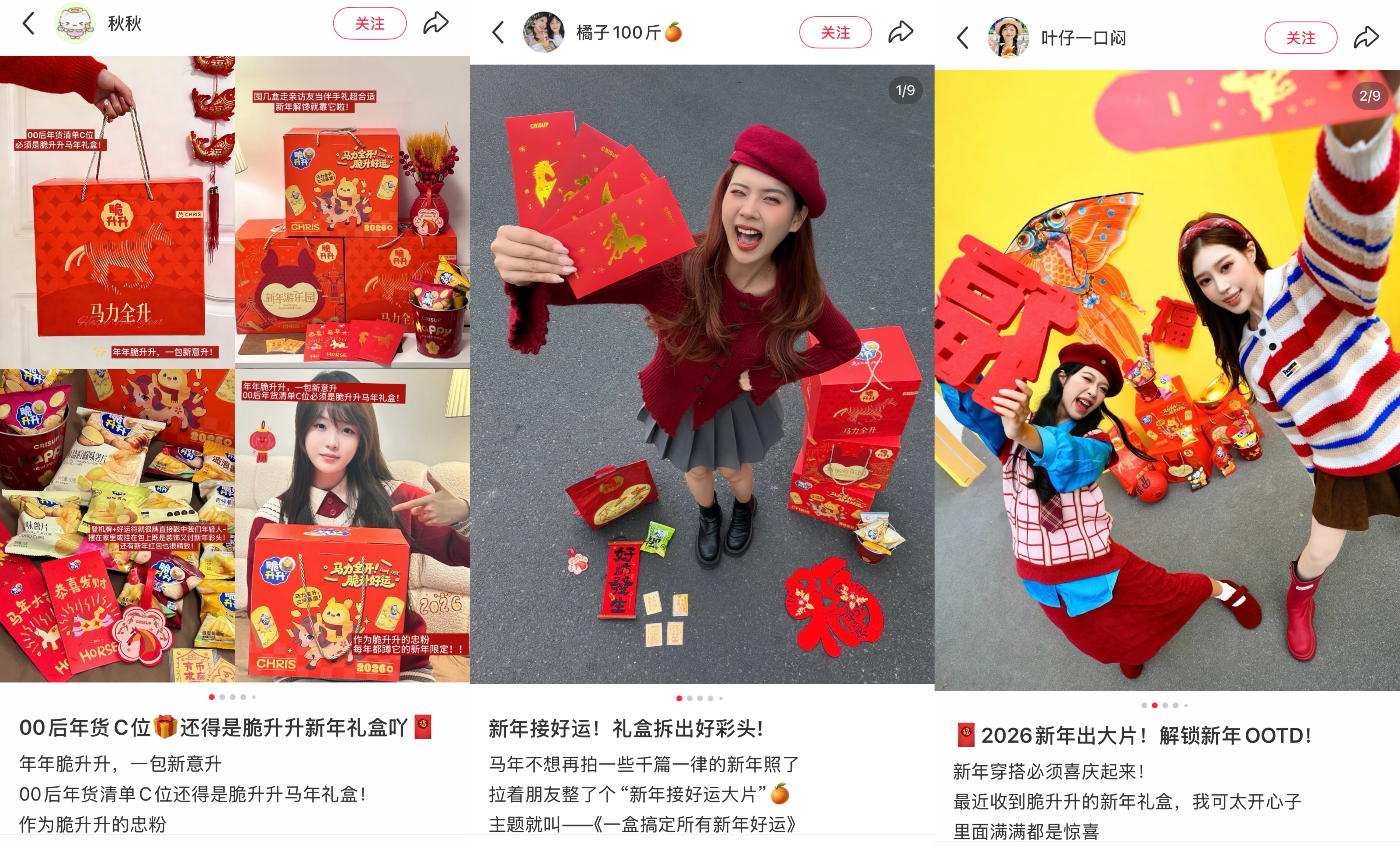 新春佳节到来之际,脆升升围绕新年「新」意输出品牌温度,同时通过新年抓马大片与创意玩梗视频唤醒关注,借助达人共创短视频和图文内容,将节日氛围感拉满引发情绪共鸣,全方位传递「年年脆升升,一包新意升」核心概念。