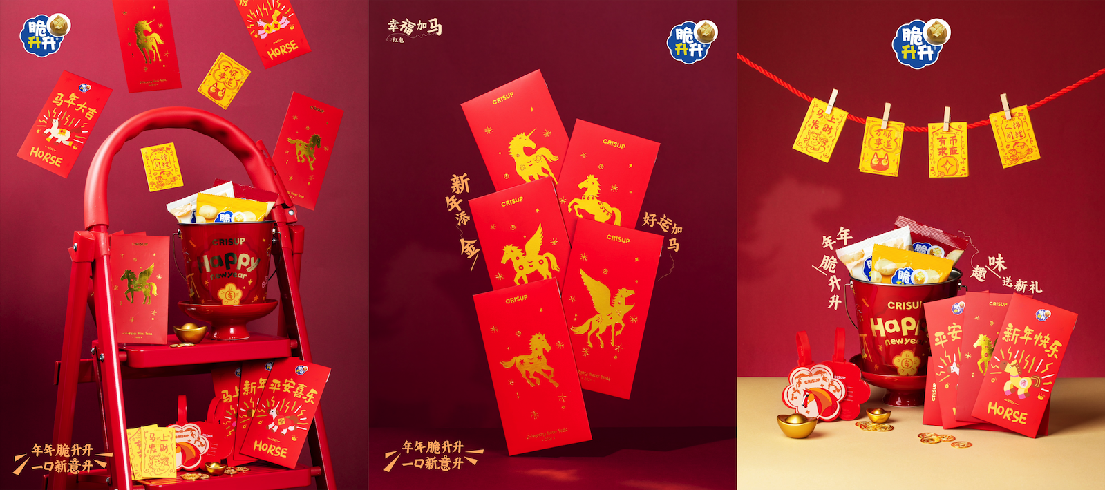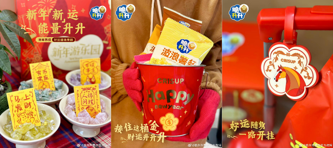 对年轻人来说,新年送「新」礼不仅是社交礼节,更是一场关于情绪转换与新年祈愿的实践。脆升升洞察年轻人春节「祛班味,拿捏好运」及「春节祈福」的情感诉求,同步推出融合马年元素的「好运符」、好运红包等创意周边,将新年系列礼盒转化为承载祝福的「情绪礼物」,助力年轻人构建新年积极能量场,拿捏新年好运磁场,马年元素和游乐园元素的加持,也进一步传递活力、好运与欢乐的节日情绪。