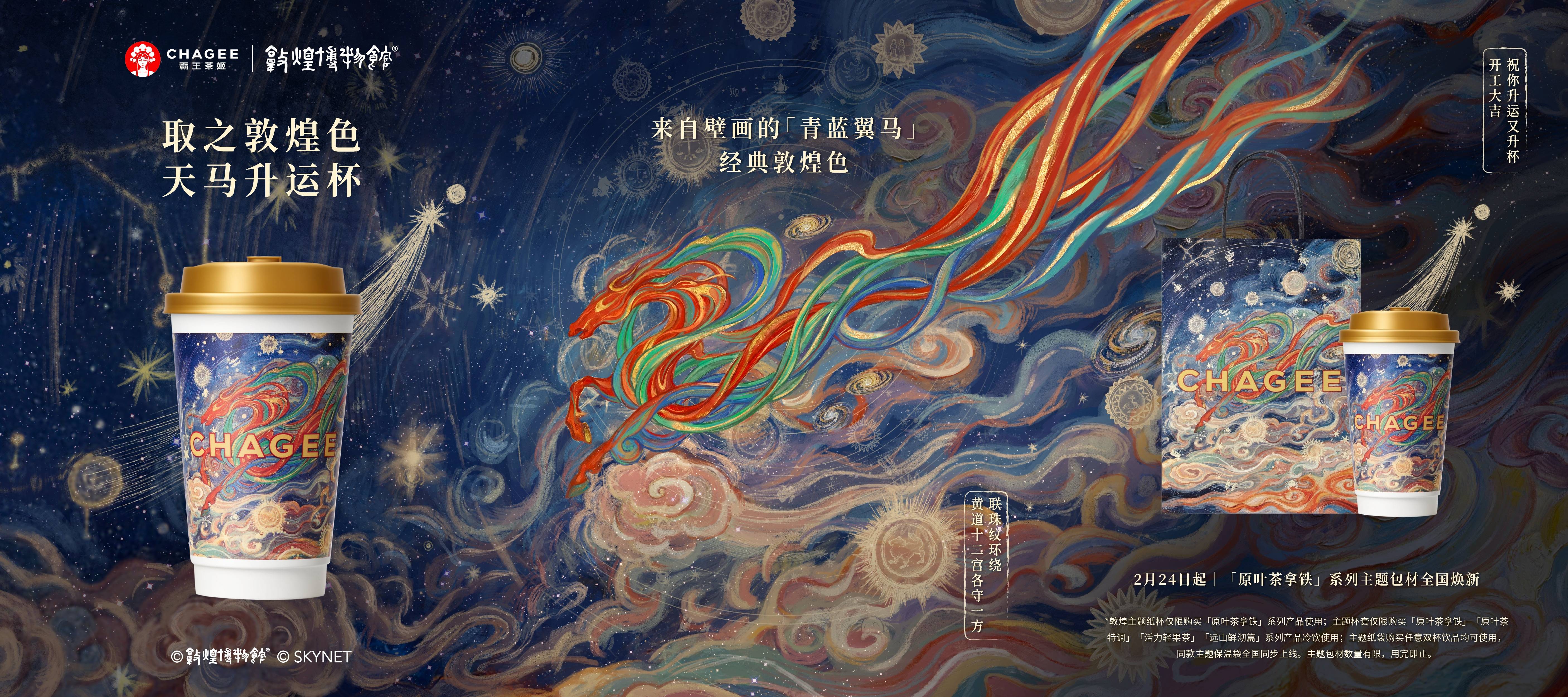 在全国范围内,2 月 24 日起至 3 月 20 日品牌也将联合敦煌博物馆为原叶茶拿铁全系列打造天马敦煌主题视觉并新增「升运杯」杯型,同步发起 #开工第一杯喝霸王茶姬 相关话题活动,发放 10000 杯「升运兑换券」,活动期间消费者还可以免费中杯升大杯,一起奔赴更开阔的天地,抵达好春光!