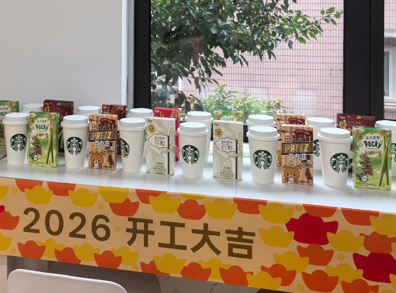在这种极度的精神内耗与开工焦虑中,品牌成了最先递上「续命水」的人。茶饮、咖啡品牌们争相卡位「开工第一杯」,让随手可及的茶咖成为「开工好运」的情绪载体,一并附上元气满满的吉祥祝福,以此抚慰年轻人的「开工创伤」。更有品牌通过低成本、轻量化的剪彩互动,或是推出具有社交属性的周边,为「都市隶人」接下开年好彩头,轻松化解节后综合症。