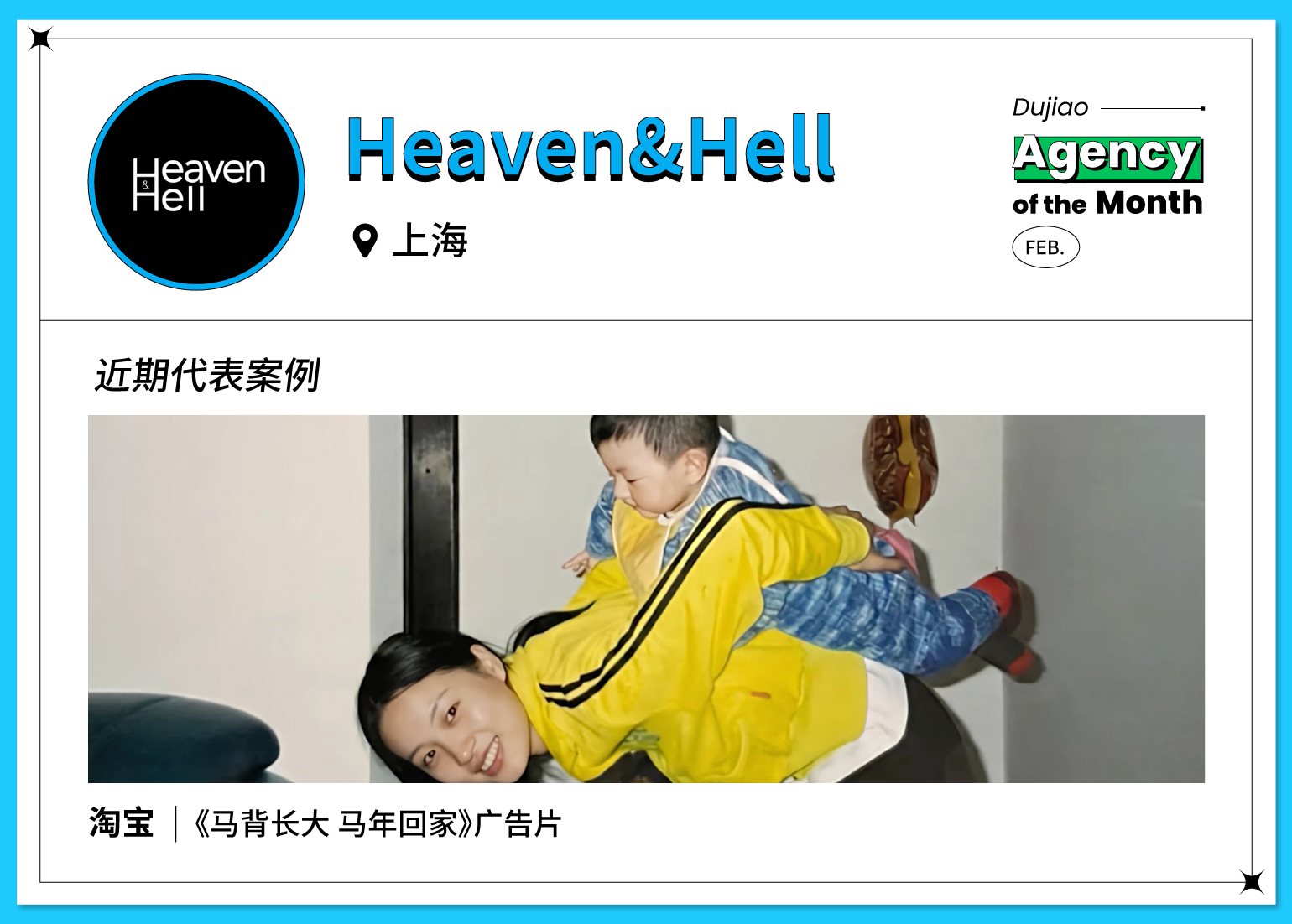 自 2019 年成立以来,Heaven&Hell 凭借敏锐社会洞察与创意产出被大家记住,从「天猫识遗计划」,到淘宝「老宝贝上新」公益计划,再到饿了么「祝你过年不用饿了么」地铁广告,以及去年备受好评的亨氏「想赢的番茄在亨氏里」平面广告、淘宝「宝贝{经}验告诉她」公益行动等精彩创意都是出自他们之手。