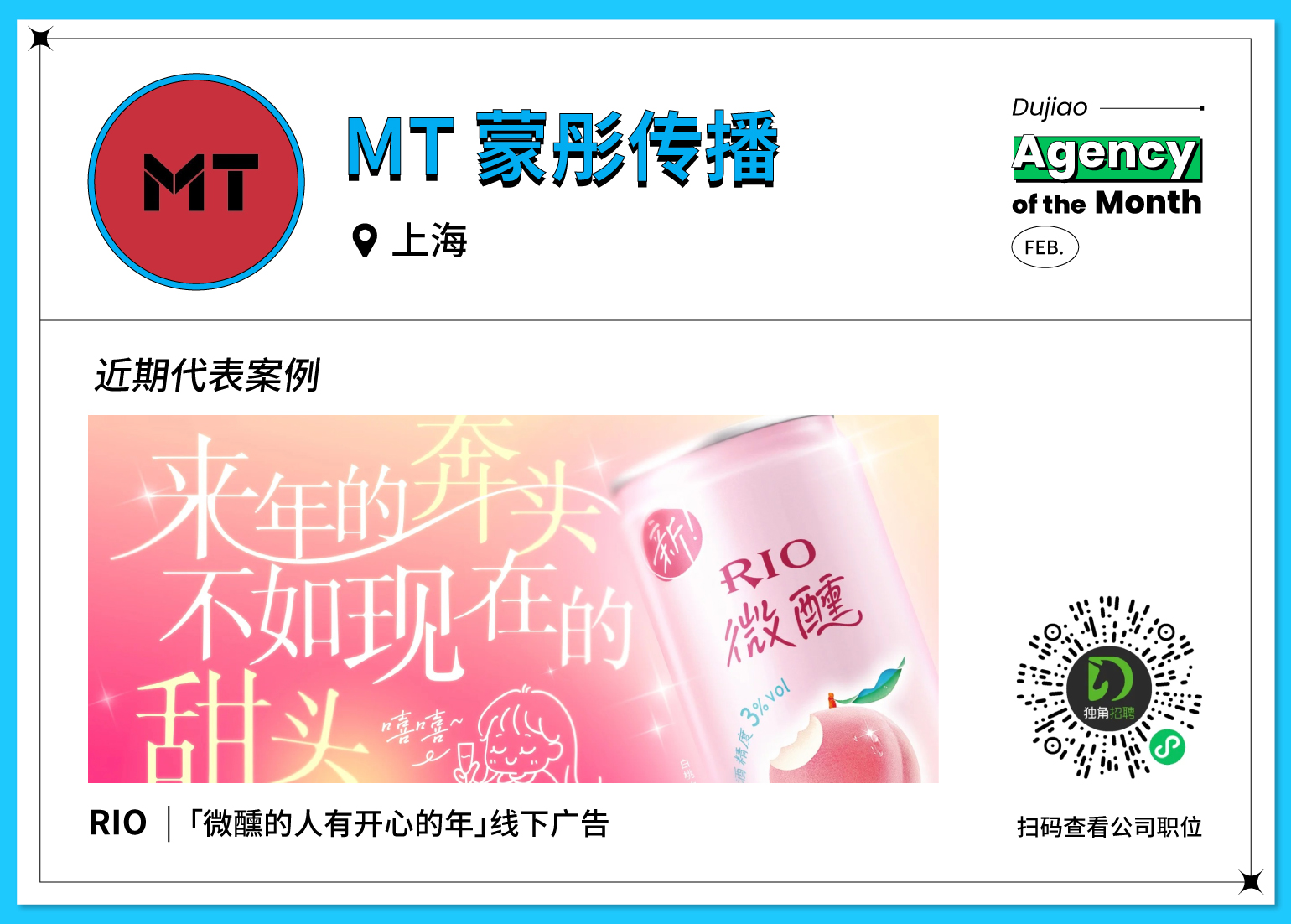 MT 蒙彤传播,广告圈的理科生,策略驱动的全案创意服务机构。他们为品牌新品提供选品分析-传播定位-创意落地-种割一体的端到端一站式爆品孵化方案。经过多年的发展,蒙彤打造了不少诸如蒙牛母亲节「同岁妈妈」、抖音 × 莫言《有人读着,书就活着》、家乐「吉食上桌,乐上家乐」新年营销、RIO × 闫妮「闫妮成为 RIO 微醺品牌大使」、麦当劳「我去麦麦岛啦」地铁广告等精彩营销案例。
