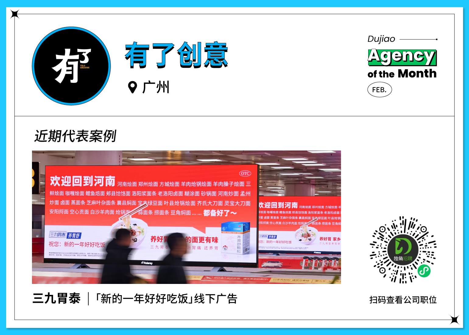 有了创意,是一家成立于 2021 年的年轻创意热店,专注于超级事件营销,擅长内容新意与创新媒介的组合拳。近年他们打造过汇仁药业「广告贴了一半就开始累了」户外创意广告、燕之屋「中秋第一个想到的人」户外广告牌、999 感冒灵「风太大了 小心感冒」线下广告等多个极具记忆点的创意作品,并入选年度新锐代理商。