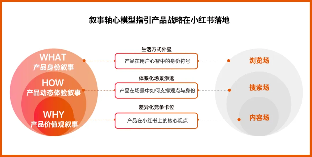 在这一背景下,报告中提出「叙事轴心」这一核心思考模型,即品牌需要通过构建一套完整的产品叙事体系「价值观(WHY)→场景渗透(HOW)→身份符号(WHAT)」,驱动产品战略在小红书平台的所有落地动作。