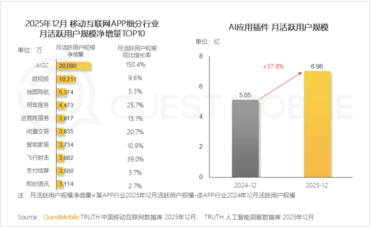 AI 已深入影响行业发展,QuestMobile 数据显示,2025 年 12 月,AIGC APP 行业月活跃用户规模净增量超 2 亿,MAU 同比增速达 150.4%,均位于细分行业首位。