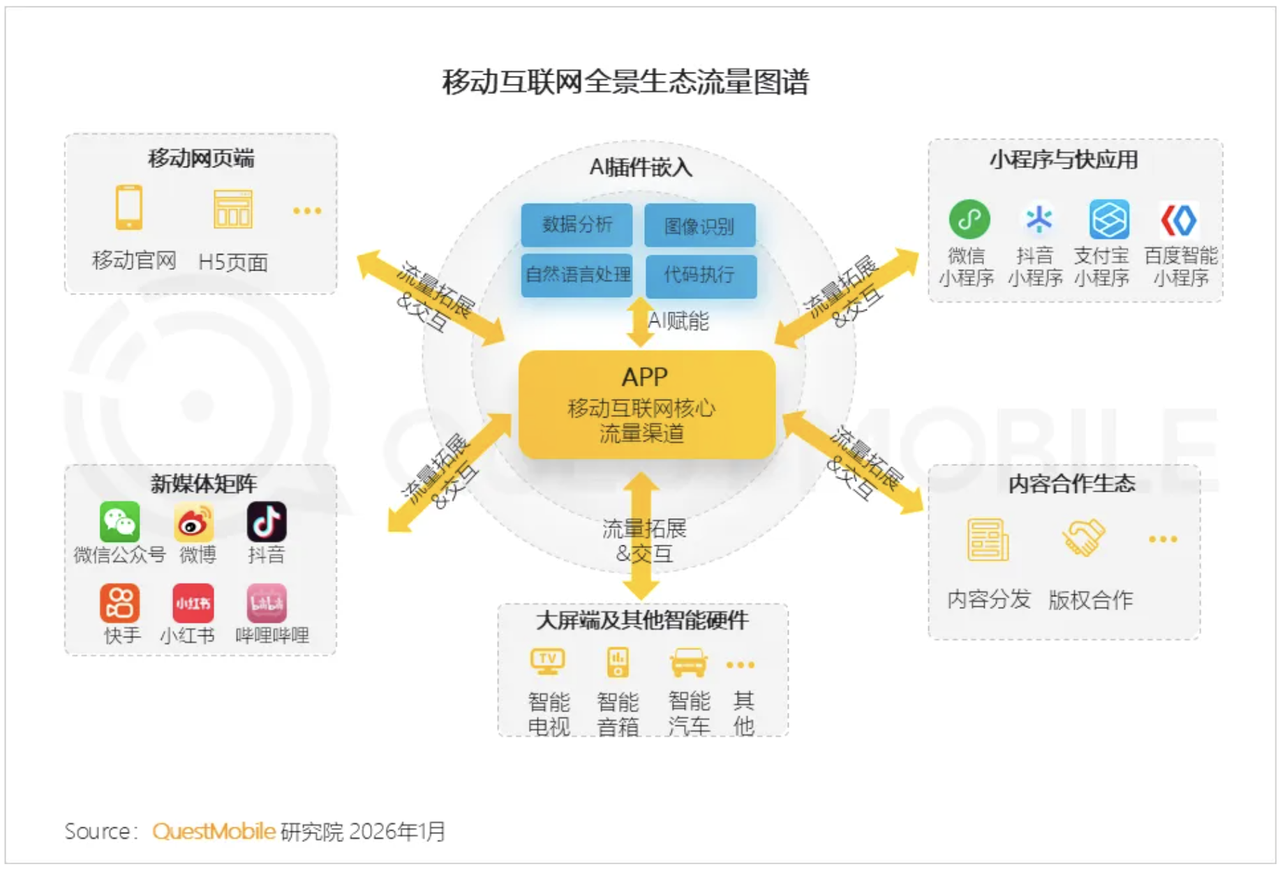 小程序已成为传统 APP 的重要补充渠道,尤其在旅游、美食、金融、办公及快递服务类场景中,通过轻量化触达、跨平台分发,有效扩大了用户覆盖面。移动互联网生态正迈向以 APP 为核心枢纽,AI 技术驱动、多端深度协同与生态融合共促流量增长的新范式。