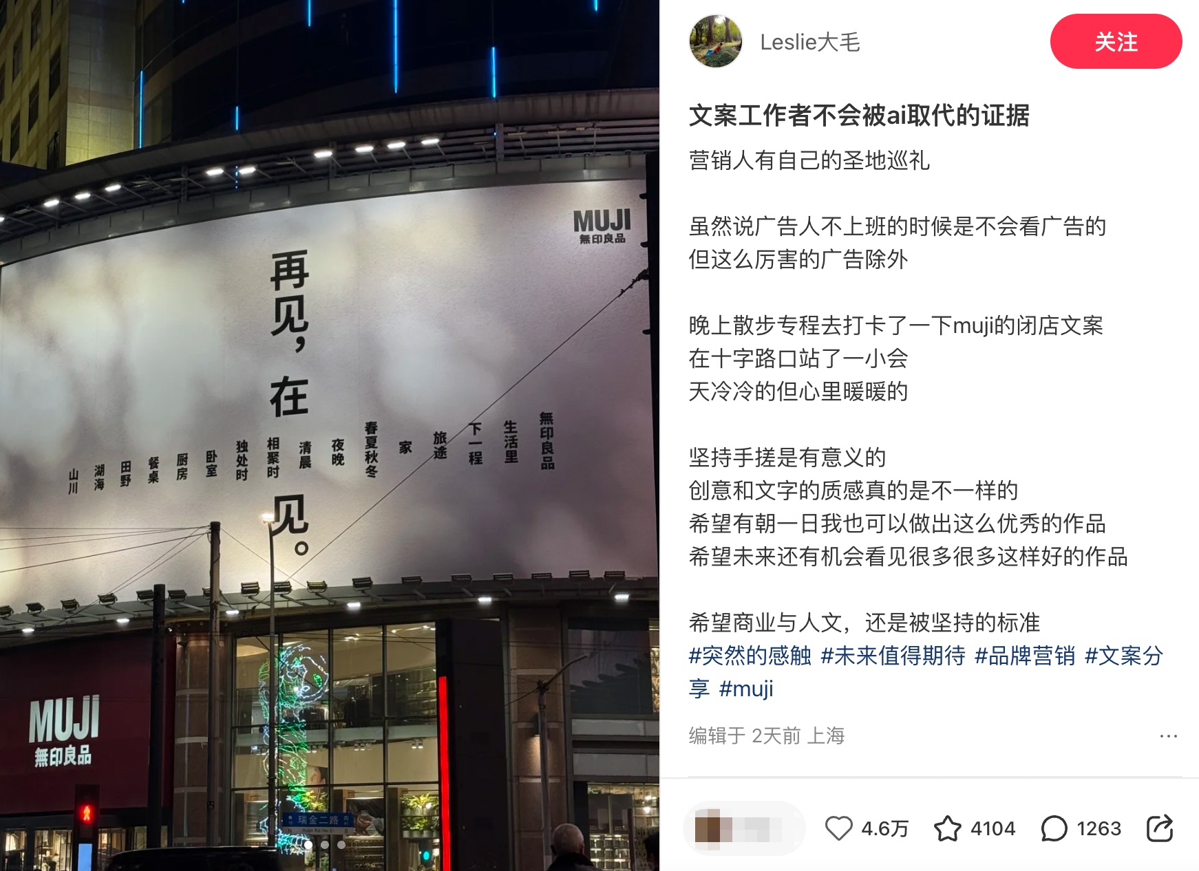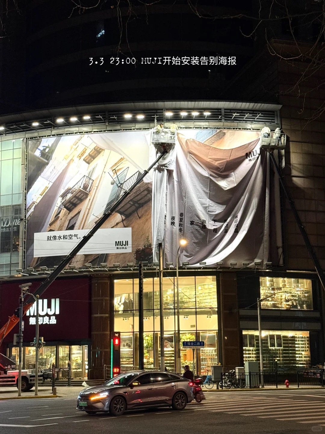 在网友镜头下的施工现场,新旧两幅海报于夜色中意外同框,形成了一种微妙的呼应——无论主题如何变化,MUJI 始终通过克制、留白却极具情绪共鸣的视觉表达,直指「生活」这一核心关键词,唤醒人们对自然的感知、对日常生活的热爱。