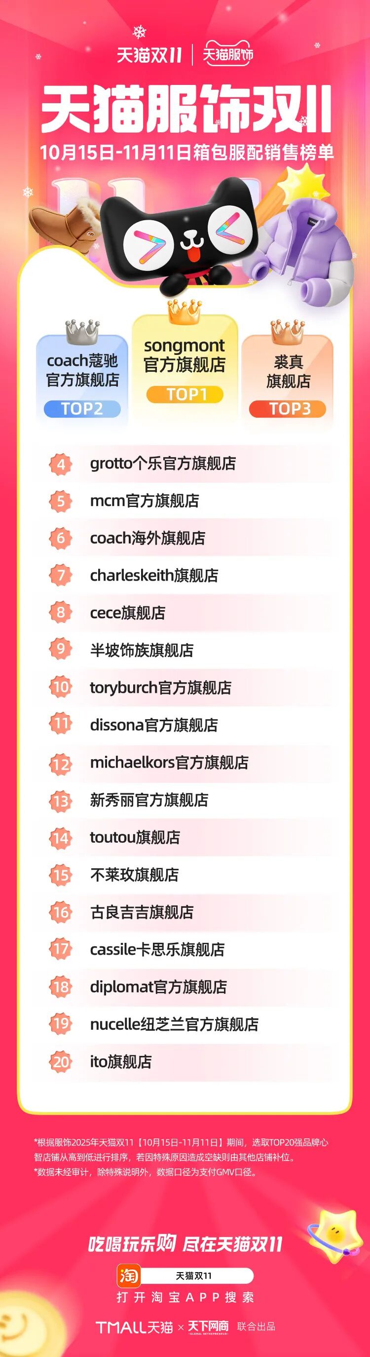 在这份热闹的品牌图景里,我们也留意到一个相对低调的名字。2025 年天猫服饰双 11 箱包配饰销售榜单前四位中,紧随 Songmont、Coach、裘真之后的,是一个创立于 2001 年、名为 GROTTO 个乐的品牌。