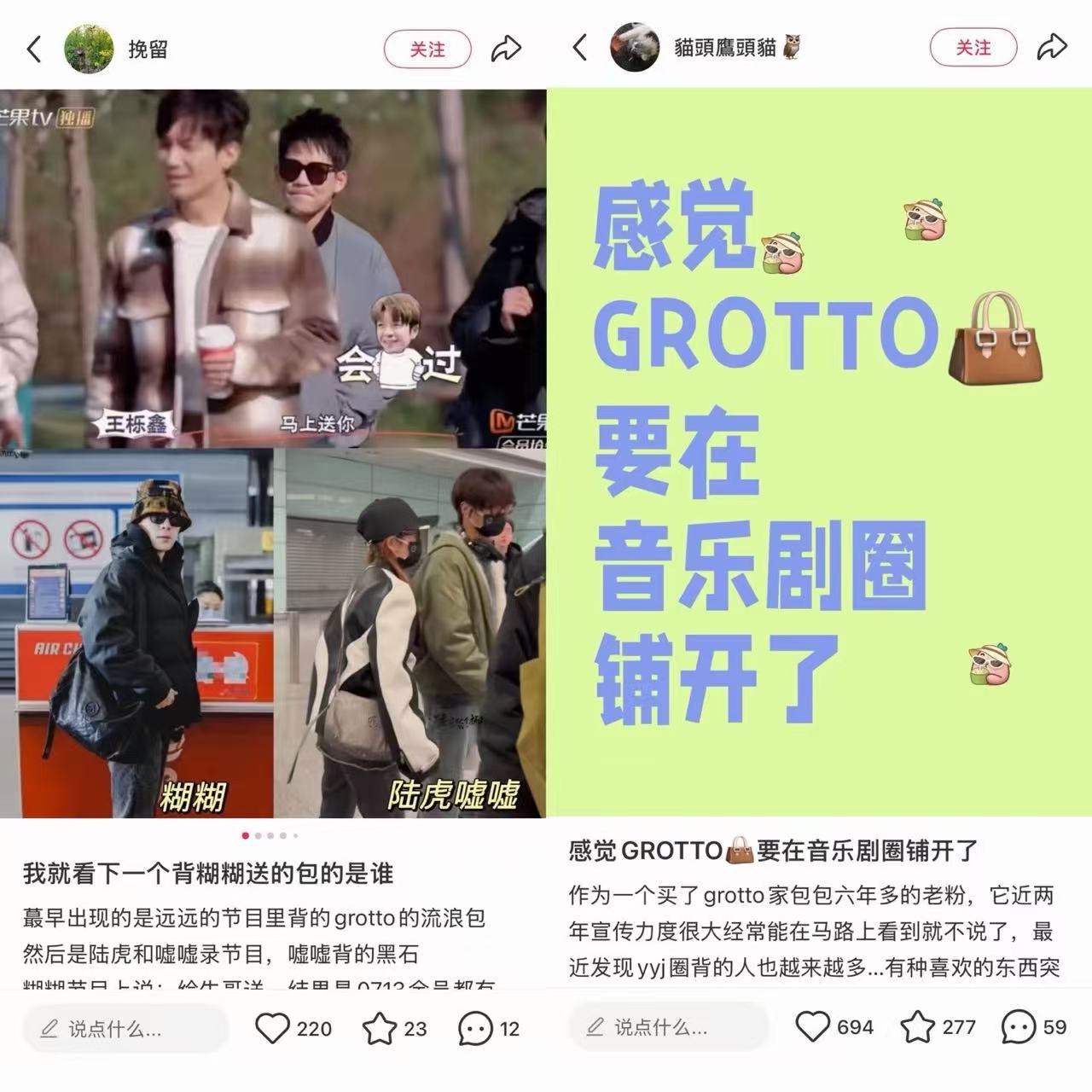 2024 年芒果综艺《快乐老友记》中,看到王栎鑫随身背的 GROTTO 黑石包,陈楚生随口一句「这包我上次差点买了」,随后王栎鑫大方安排,给再就业男团成员每人送上一只包,让 GROTTO 个乐无形间成了 0713 兄弟情的见证,在粉丝圈小范围出圈,成了「再就业男团同款」。而去年下半年,因多位音乐剧演员都背上了 GROTTO 个乐,又让不少剧迷种草了多款个乐「上班包」。