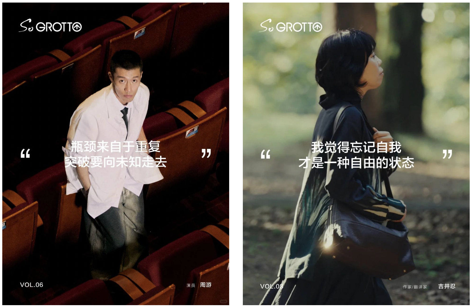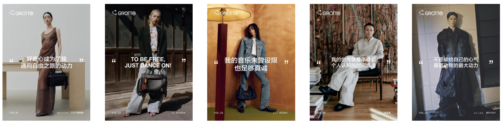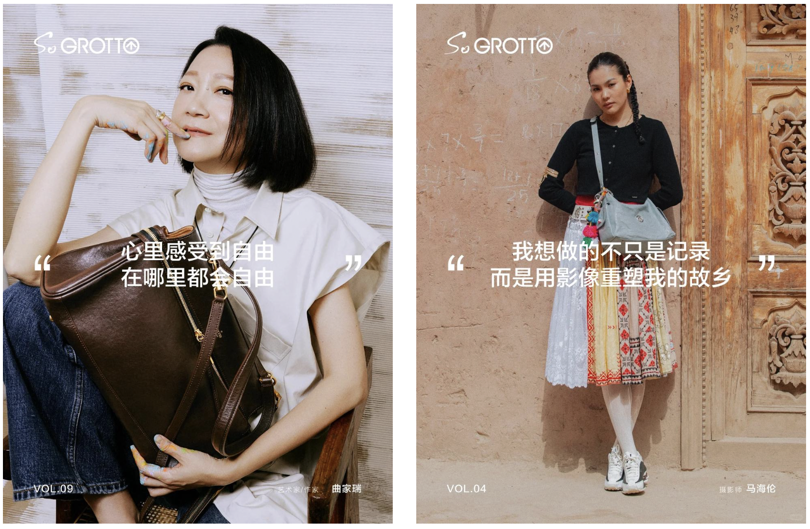 这种不被定义、持续生长的生活态度,不仅与品牌倡导的自由内核高度同频,也与当代年轻人在快节奏生活中寻求自我认同与成长空间的精神诉求相契合。每期对谈中,多款 GROTTO 包袋的质感设计与百搭属性与影响者的故事形成隐性关联,也成为了扩展产品价值的重要一环。