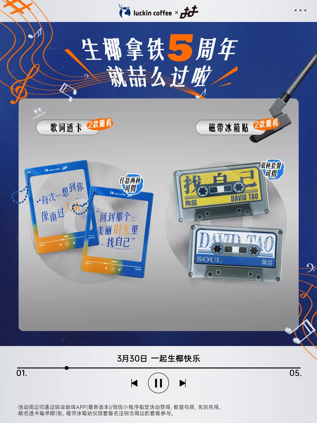 除了包材,瑞幸还把周边玩出了收藏级质感:磁带金属冰箱贴复刻 90 年代卡带外观,分别对应蓝、黄两张经典专辑配色;印章挂件紧扣《流沙》意象,呼应歌名的同时,又暗喻时光流逝;歌词透卡精选《找自己》《普通朋友》等金曲歌词,既是打卡道具,也是随身携带的 mini 歌单;联名冷变杯则在倒入冰饮后缓缓浮现《找自己》歌词,进一步强化互动感与仪式感。