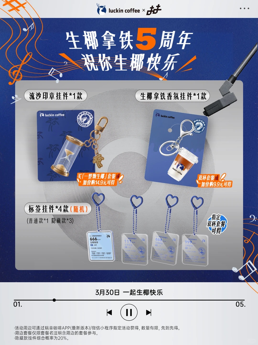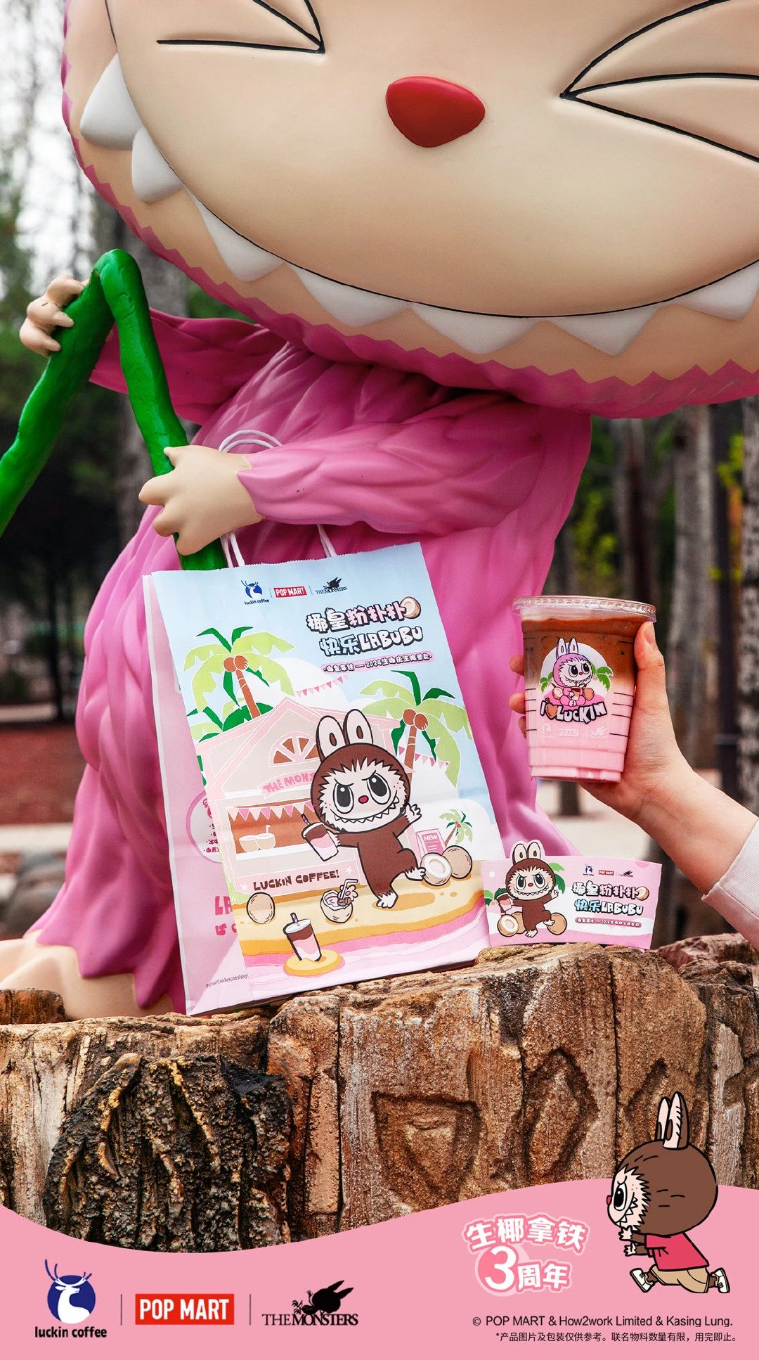 三周年,瑞幸邀请腾格尔成为瑞幸生椰拿铁庆生官,他用一首轻松的《生椰快乐歌》为生椰拿铁送上「硬核」生日祝福。同时还请到 THE MONSTERS(精灵天团) 一起加入三周年庆生派对,解锁了联名「椰皇拿铁」。通过这一系列庆生事件,瑞幸将单品庆生逐渐打造成品牌与消费者之间固定的仪式感。