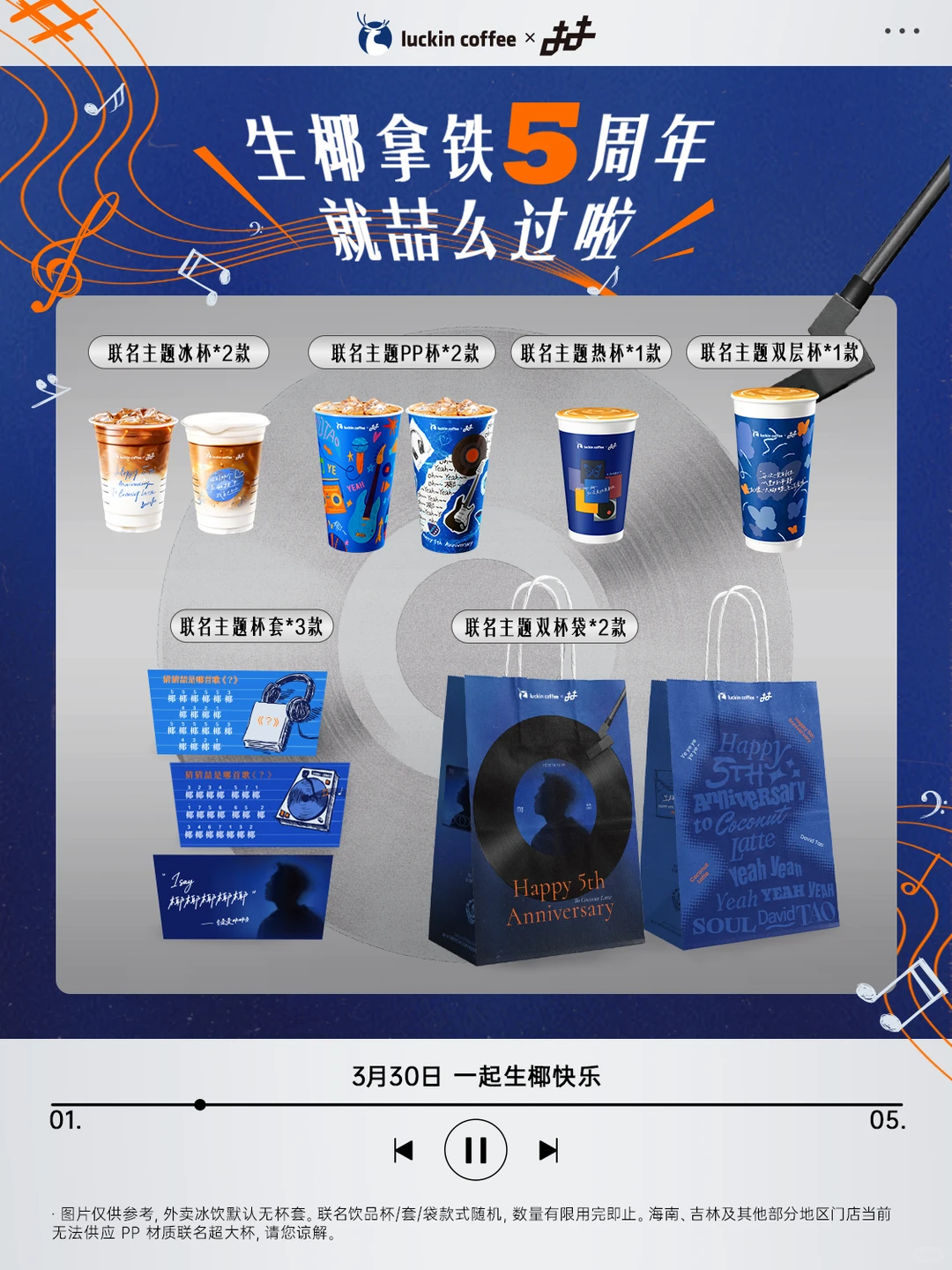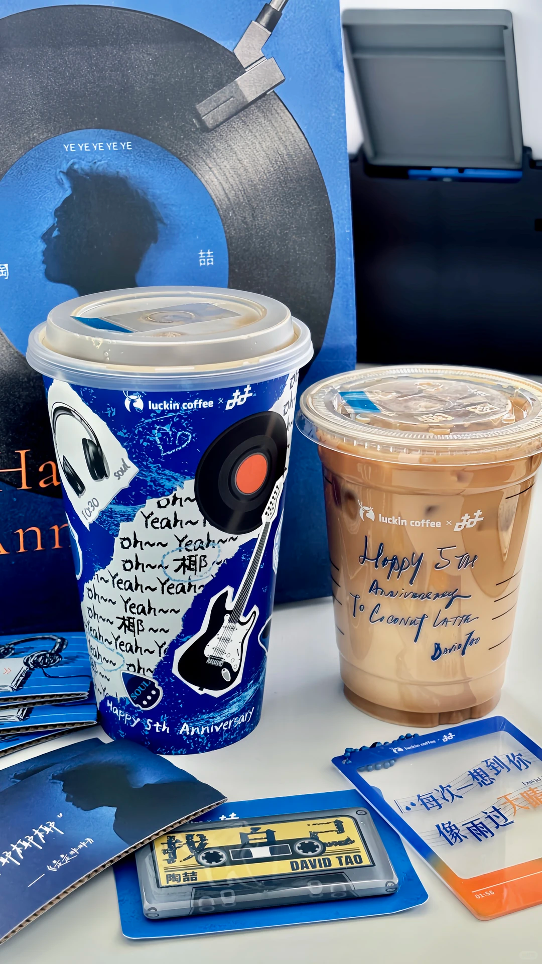 联名纸袋与杯袋采用黑胶唱片纹路,复刻《Soul Power》等经典专辑的设计语言;杯身印满「oh yeah」字样,与 slogan「椰椰椰椰椰」形成声画联动,把音乐符号和产品卖点牢牢绑定。
