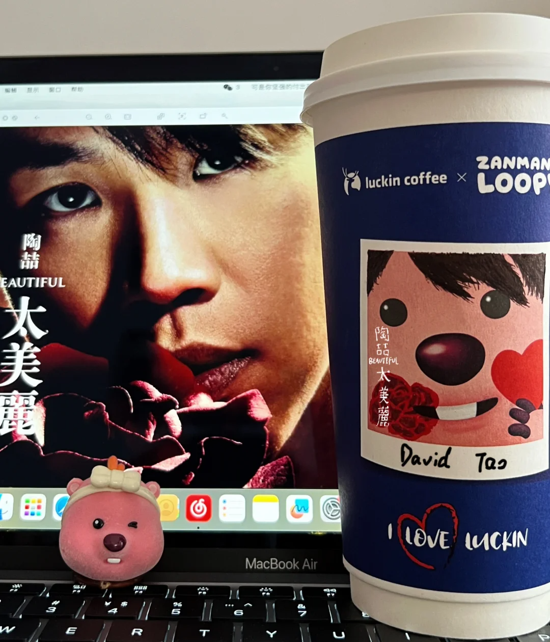更不用说,陶喆自带的抽象气质,早为这次联名埋下伏笔。2024 年瑞幸与 loopy 进行联名时,就被网友调侃像是和陶喆的联名,不少粉丝更是直接动手二创,拿起马克笔在粉色小海狸的额头上画上一片黑色刘海,在嘴巴附近再添上一朵红玫瑰,自制「陶喆太美丽蓝专杯」。