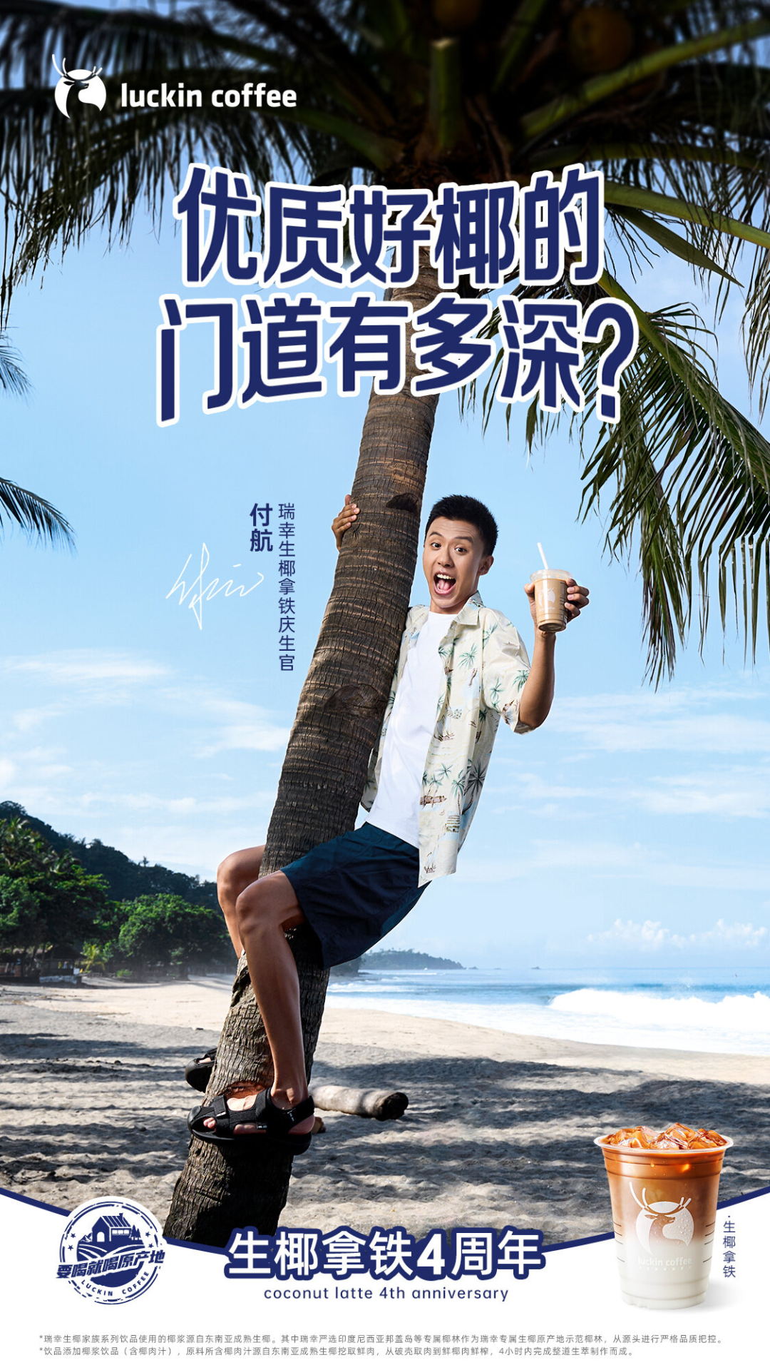 四周年,瑞幸请到了「猴系男孩」付航,让大家随第一代「瑞幸生椰岛岛主」付航一起踏上取椰之路。瑞幸提取「猴子」的人物梗,以产地溯源的形式强化王牌单品的产品力。