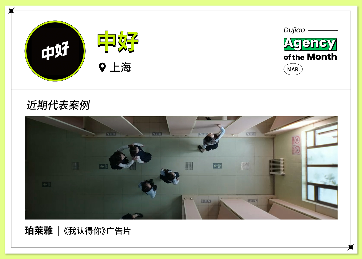 中好,2011 年成立于上海,经过多年的整合、优化,中好发展成为⼀家集策略、创意、 制作、传播、⼀体的品牌营销公司。近年来,从天猫「新中式妈妈大赏」、淘宝闪购「FOLLOW『幂』」,到蒙牛×《哪吒 2》联动广告片,再到到顾家家居的户外「软广告」、「夜淘宝」系列广告牌等媒介创意,他们不拘泥于创意形式,一直保持高水准的作品产出。