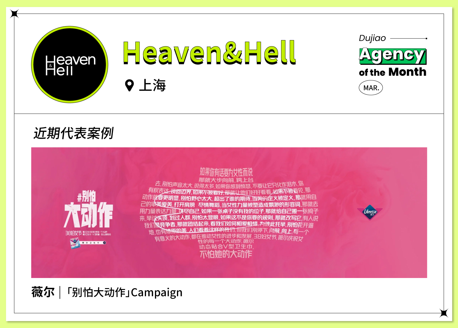 自 2019 年成立以来,Heaven&Hell 凭借敏锐社会洞察与创意产出被大家记住,从「天猫识遗计划」,到淘宝「老宝贝上新」公益计划,再到饿了么「祝你过年不用饿了么」地铁广告,以及去年备受好评的亨氏「想赢的番茄在亨氏里」平面广告、淘宝「宝贝{经}验告诉她」公益行动等精彩创意都出自他们之手。