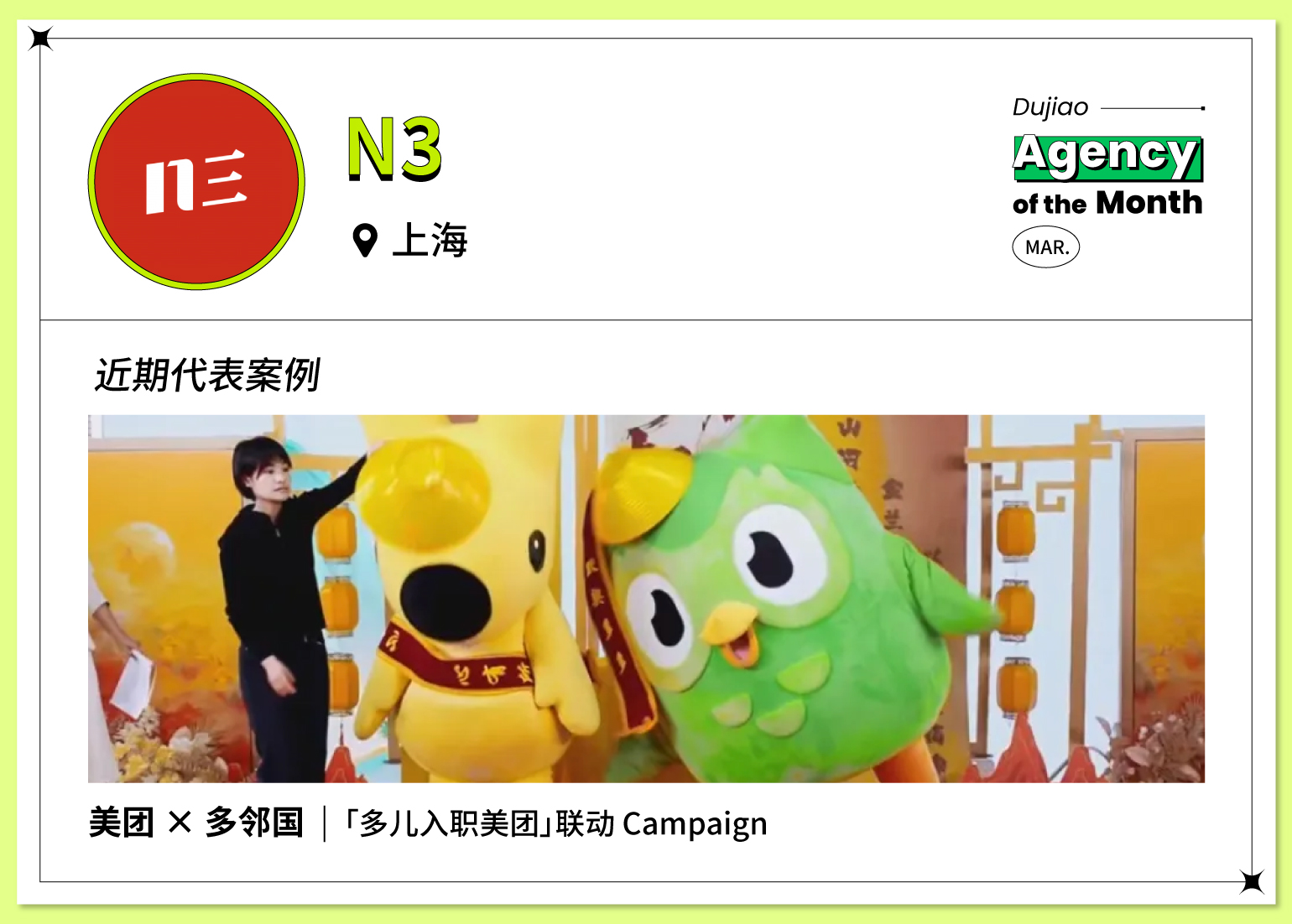 近期,顶流多儿的「离职再就业」之路在各大社交平台持续发酵,这其实是美团 × 多邻国的品牌联动事件。作为幕后的助推团队之一,N3 精心策划了「连续剧式」的联动话题,从鸟鼠结拜大典、到多儿送外卖,引发了全网刷屏式讨论,美团也借着多儿的活人感,快速拉近与年轻学生、职场打工人的距离。