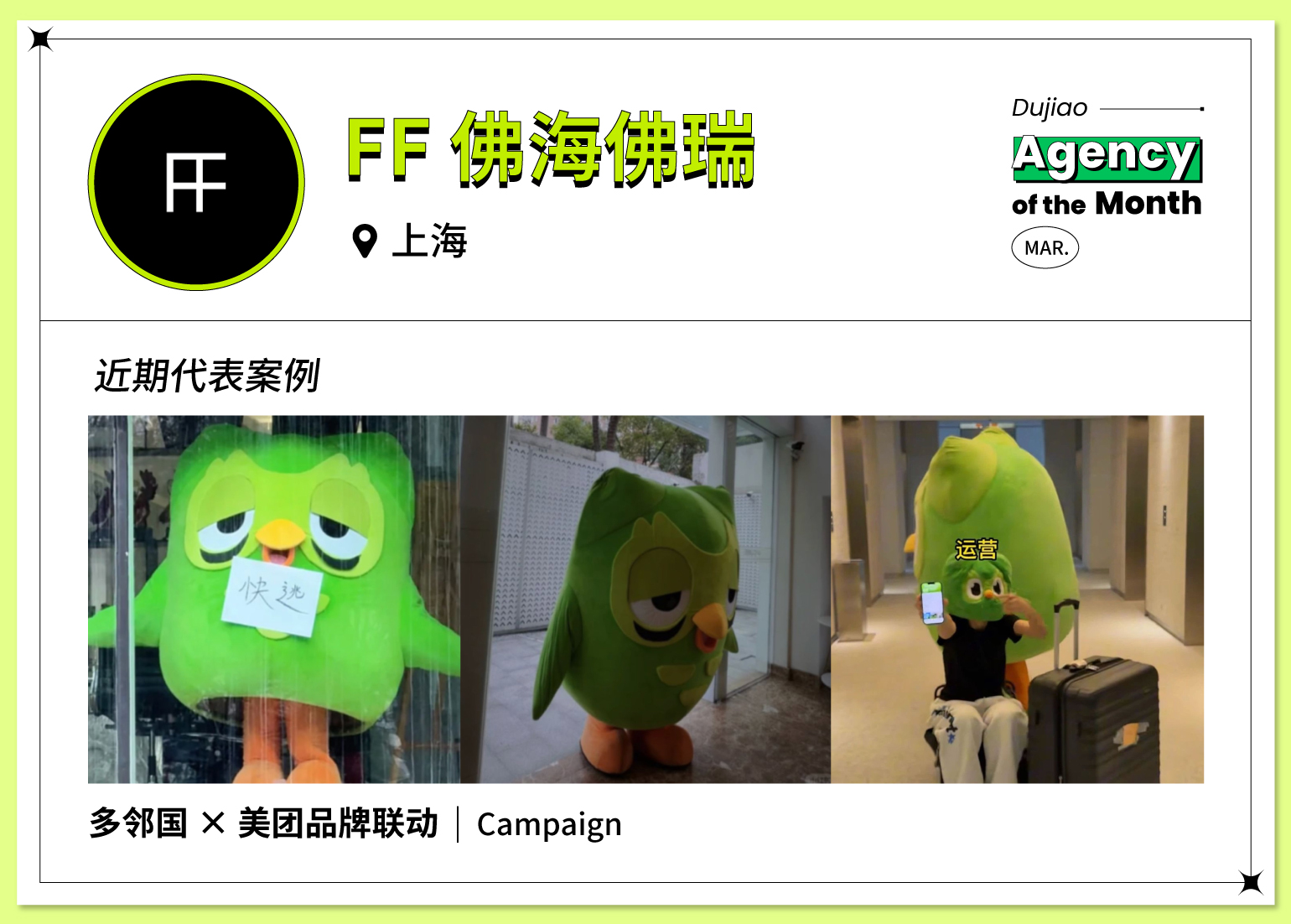 3 月美团 × 多邻国品牌联动事件的出圈讨论,也少不了 FF 佛海佛瑞的创意助力。此次联动,从月初的离职大戏就开始造势,当多儿的「活人感」戏码融入到生活里的外卖和吃喝玩乐场景,不仅让多邻国嵌入更广泛的生活场景,而且自然地提高了品牌声量和用户的学习频次。近年,FF 佛海佛瑞负责多邻国社交媒体内容创意,让多儿出过家也陪多儿出过嫁,陪多儿「死」掉又复活,携手品牌打造了不少颇具声量的社交玩法。