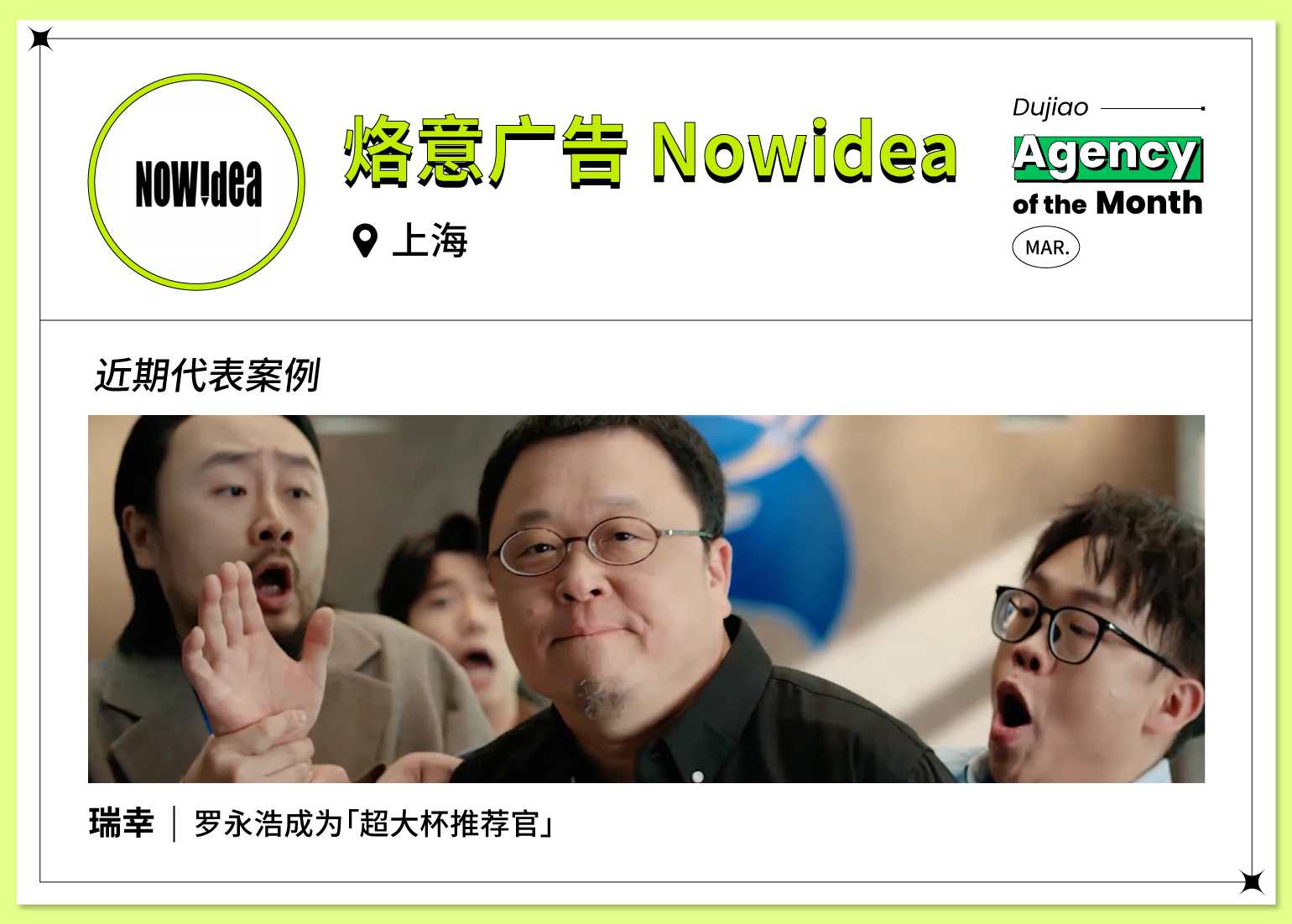瑞幸「超大杯」最新广告,因复刻罗永浩「中杯、大杯、超大杯」的名场面,引发了一波刷屏传播,其背后的代理商正是烙意广告。这一波联动巧妙用互联网名梗完成产品心智植入,他们把老罗与杯型的恩怨情仇,转化为瑞幸「超大杯」的价值认知,让原本普通的「升杯」行为,从一个单纯消费选项,变成一场有记忆点的全民传播事件。在此之前,烙意广告已与瑞幸多次合作持续开展品牌推广,助力过多邻国多儿和瑞幸 lucky 的世纪婚礼、瑞幸 × 线条小狗情人节联名,罗翔「酱香拿铁答疑小课堂」 ,以及为其王牌单品生椰拿铁打造的「生椰快乐」广告片。