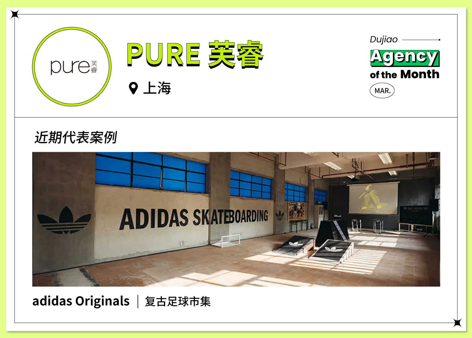 此前,我们也为大家介绍过 PURE 芙睿,一家致力于打造独具创意的线下活动,公关服务,设计和宣传活动的整合营销创意公司。他们曾多次为阿迪达斯打造颇具话题度的线下体验活动,包括:adidas Originals 2026 新春老友局、adidas Originals 「贝壳头街区」活动、adicolor 巨型艺术装置闪现北京和成都等等。除了阿迪达斯,2026 麦当劳粉丝大会、BIRKENSTOCK 250 周年上海张园限时店这些精彩的线下活动都来自 PURE 团队。