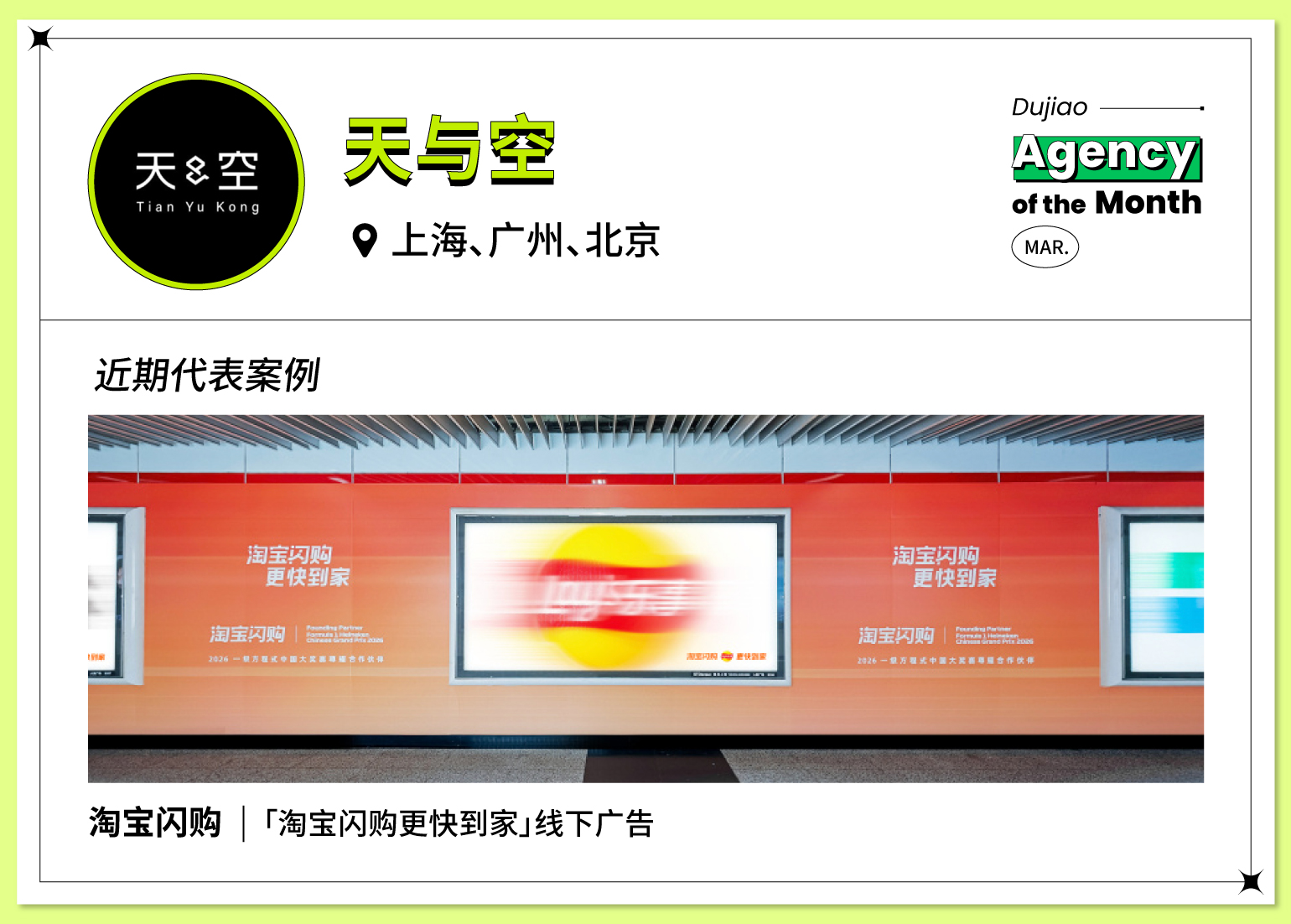 过去的一个月,话题讨论度最高的事件之一就是 F1 中国大奖赛了。作为 2026 F1 中国大奖赛尊耀合作伙伴,淘宝闪购推出了一系列营销活动。其中,天与空助力淘宝闪购在上海人民广场地铁站打造「淘宝闪购更快到家」线下广告,凭借与日常的反差亮眼出圈。他们将 23 个 logo 模糊化处理,简单直观地表达淘宝闪购「快到看不清」,以极具视觉冲击力的方式诠释「极速送达」的核心体验。在创意越来越复杂的当下,这则简单直白的广告也让天与空收获了很多讨论与好评。