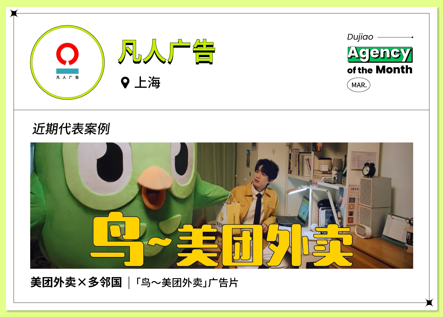 3 月他们作品颇丰,开学季,他们为美团外卖打造《开学了想开点》广告,用「想开点」双关化解「开学焦虑」,实现情绪洞察与品牌服务无缝衔接。美团 × 多邻国的品牌联动的《鸟~美团外卖》广告片也是出自他们之手。此外妇女节,他们为美团医美创作「致 3.8 节最美的广告」,没有去讲大道理和漂亮主张,而是用镜头捕捉日常生活中女孩们最自然的美丽瞬间,只想陪你漂漂亮亮,引发用户好评。
