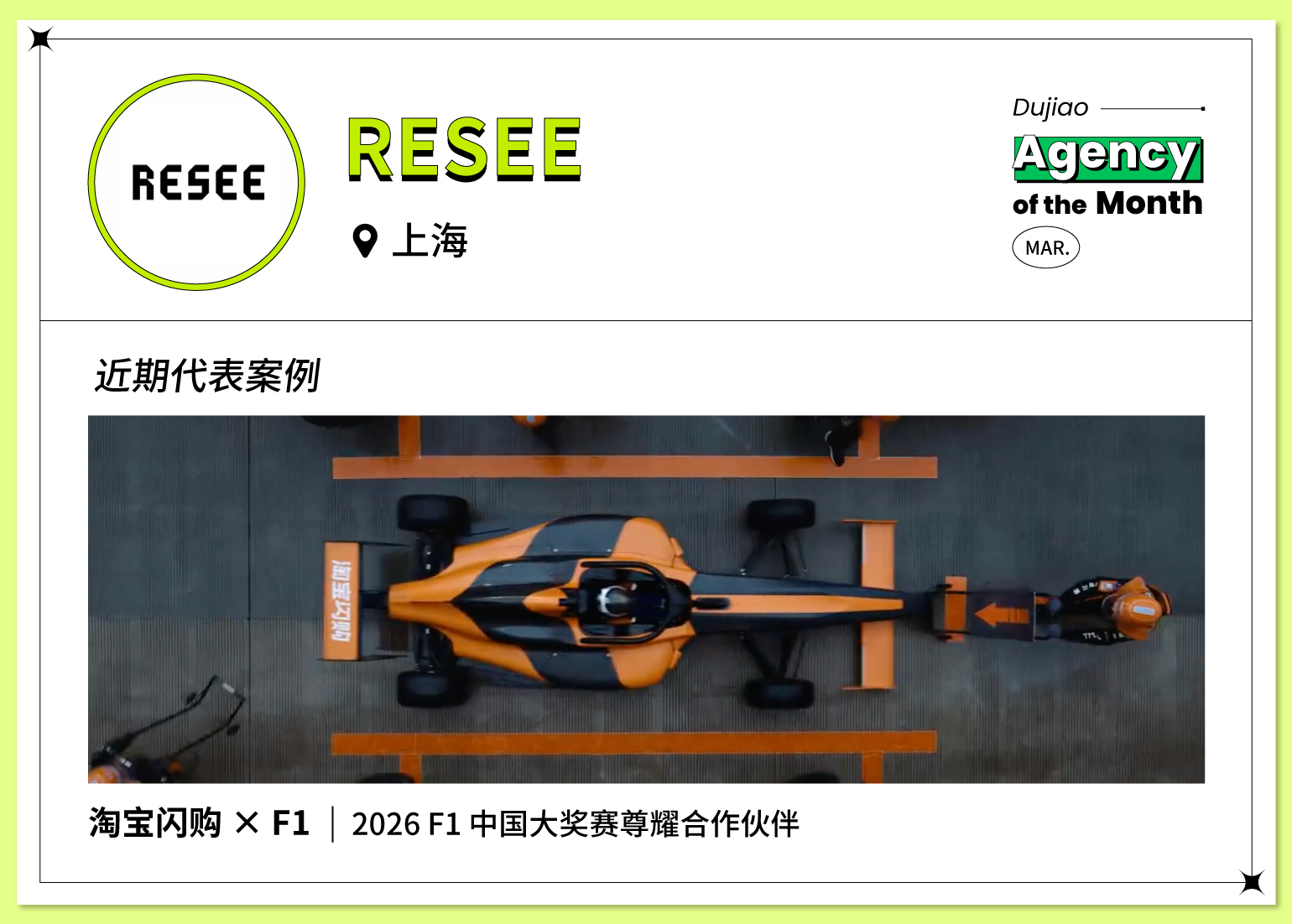 此前,因为骑手服橙黑配色与 F1 迈凯伦车队服高度相似,淘宝闪购就被网友建议直接与 F1 合作。3 月,淘宝闪购发布品牌广告,正式宣布成为 2026 F1 中国大奖赛尊耀合作伙伴,这背后的创意代理商正是 RESEE。他们将外卖骑士标志性的取餐与送餐过程,以及骑手间的相互协作,与 F1 最具标志性的 Pit Stop 换胎场景与结合,完成创意上的巧妙连接。短片通过目不暇接的画面助力淘宝闪购传递「更快」的品牌信息,成功借势 F1 赛事刷新用户的品牌认知。