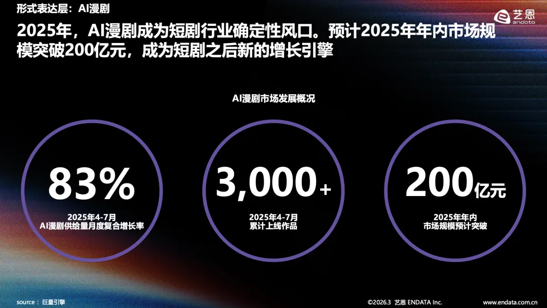 形式表达上,精品化已成为重要发展趋势。优质剧集开始呈现长尾价值,用户对短剧的评价标准也上升至制作水平层面。同时,AI 漫剧成为短剧行业确定性风口,已跑出至少 42 部破亿剧集,预计 2025 年年内市场规模突破 200 亿元,成为短剧之后新的增长引擎。