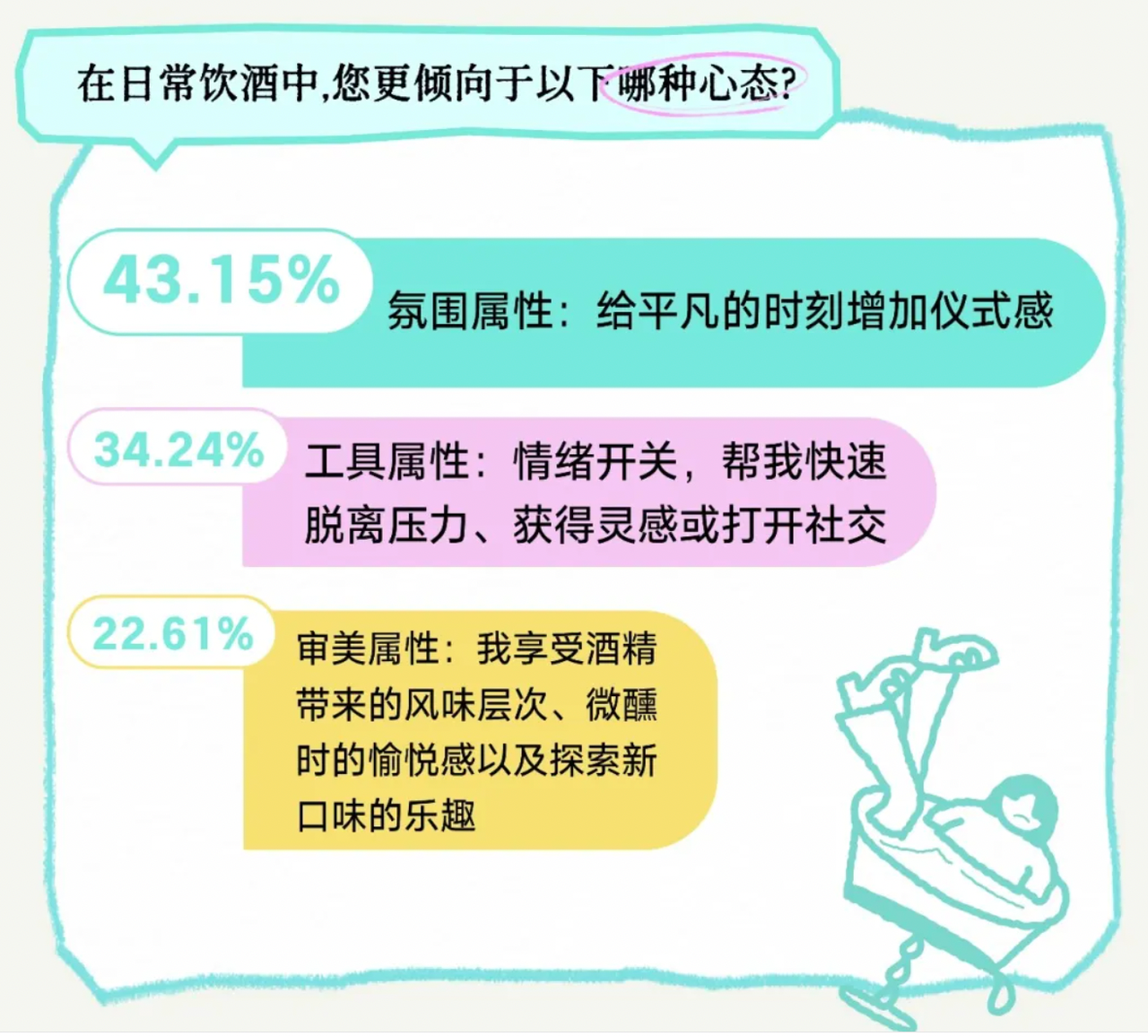 饮酒社交及场景偏好方面,2-4 人的「密友小聚」以 62.49% 的占比成为年轻人饮酒规模的主流,同时也有 17.82% 的饮酒者选择「一人我饮酒醉」,独处场景展现出前所未有的增长潜力;超四成 Z 世代认为酒能增添生活「仪式感」,推动饮酒从特殊场合融入日常美学。更有 12.6% 的人会在加班或学习时饮酒提神,「生产力饮酒」成为独特的都市现象,酒被赋予对抗压力的「功能性饮品」角色。